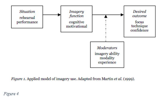 The applied model of imagery use in sports was developed by Martin et al. (1999). The goal of this model was to guide the practice of imagery and thereby creating more effectiveness of that practice. In sports, it turned out that the relationship between the practice of imagery and the desired outcome is not perfect. They found several other variables to be of influence: the imagery ability, the skill level and the type of sport. Gregg and Clark (2007) find that this might also be the case for the use of imagery in music. For example: classical schooled musicians that have to perform a lot, use imagery more than non-performance majors. Also, the use of imagery in music can be influenced by the type of instrument. For example, singers might use imagery more than instrumental musicians.