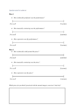In the second part of the study data was collected from an audience survey. Although the most important factor was the musicians’ own experience, it was also important to see if the participant’s own experiences were also visible to the public. A mini concert was organized in which the participant performed both pieces. A survey specially designed for this and focussed specifically on the technical proficiency, the musical intention and expressiveness of the piece. The audience filled in the survey while listening to the pieces. The final question asked the audience which piece they believed to be the imagery-practiced piece. The full survey can be found in the first attachment below. The second attachment contains the survey the participant has to fill out after the performance.