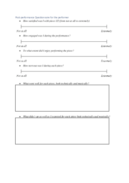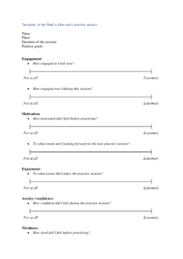 The journal questions can be found in the attachment below. The questions were measured using a 10 cm visual analogue scale (VAS) and the questions focussed on the indicators described in the variables-section. The VAS measurement is especially suited for this research because it is difficult to directly measure indicators like enjoyment or confidence. Therefore, a measurement that is able to measure the continuum of values is more suited. The question focussed on the level of engagement, the level of motivation, the level of enjoyment, the level of confidence and the level of tiredness before and after each practice session. Furthermore, the questionnaire asks the participant if there are any external factors that might have influenced the practice session.