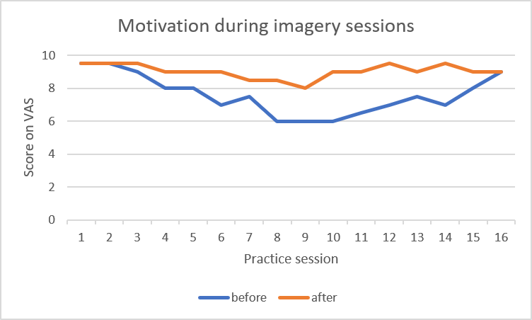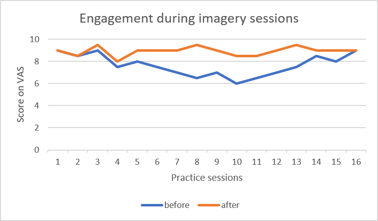 The expectation was that the imagery sessions would have a positive impact on the level of engagement, motivation, confidence, tiredness and enjoyment of the participant. In all cases the results for the imagery sessions were different from the results of the normal sessions. The results of the normal sessions, however, were comparable with the results before the intervention started. This indicates that there is indeed a relationship between imagery sessions and the level of engagement, motivation, confidence, tiredness and enjoyment of the participant.