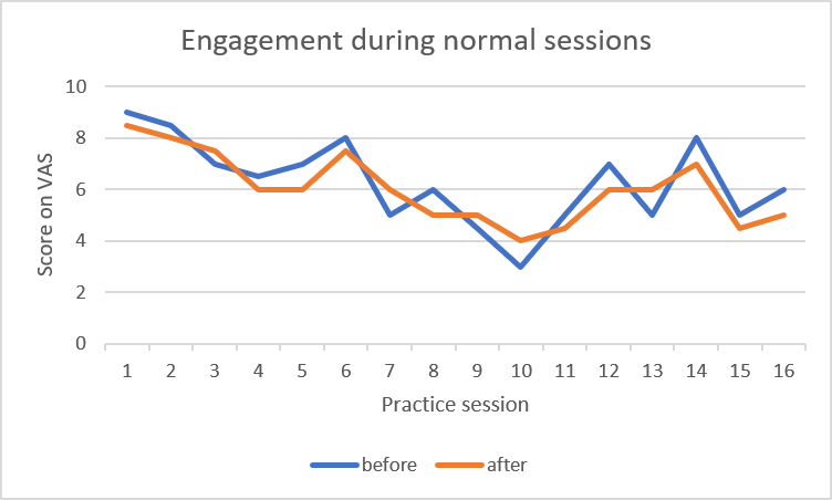 The largest difference between the normal and the imagery sessions when it comes to the levels of engagement were that engagement was rather stable and high for the imagery sessions and fluctuating a lot for the normal practice sessions. It is to be expected that at the beginning of the intervention the participant felt more engaged with the project, but it could also have been the case that the engagement dropped after a few sessions because the exercises did not work the way the participant hoped they would. This pattern can be found for the normal sessions: at first the participant is quite engaged but after some sessions, this dropped. Furthermore, the results indicate that the normal practice sessions were much more influenced by external factors and the level of tiredness of the participant than the imagery practice sessions were. This becomes clear from the difference before and after the session. Due to external factors, engagement can be low before the session, but the results from the imagery sessions show that the engagement after was always high. Further, there is no visible relationship between before and after, whereas this is more the case for the normal sessions.