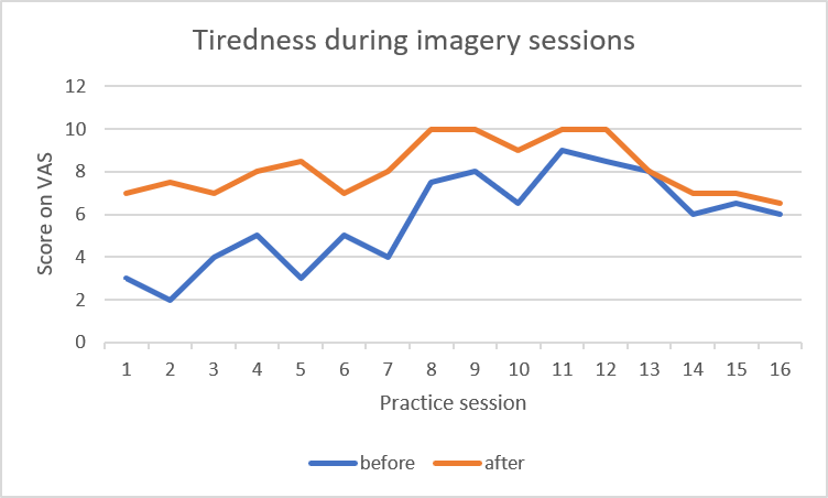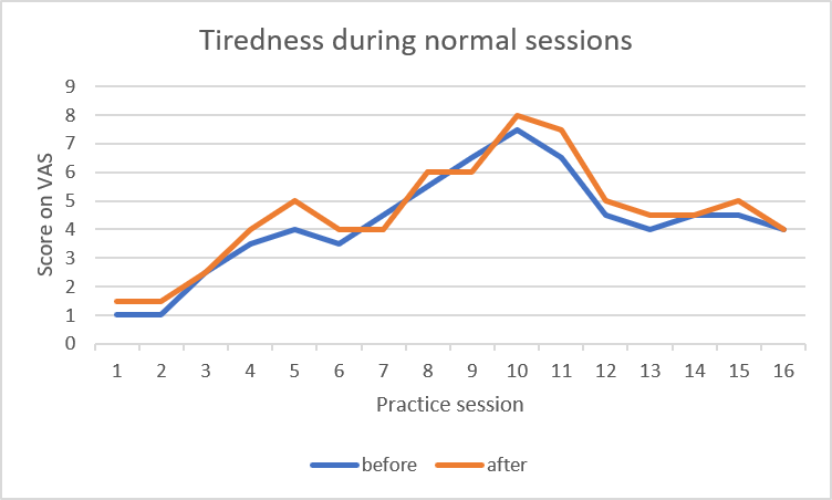 The figure below indicates the tiredness for the normal practice sessions without the imagery exercises applied.