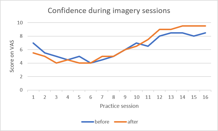 For the first imagery sessions the level of confidence before is higher than the level of confidence after each session. After a while, the difference becomes smaller and sometimes the participant felt more confident after the session, but sometimes it was the other way around. But, towards the end of the intervention, confidence levels are consequently higher than after the practice session than they are before. Another remarkable pattern is that in general the confidence level starts out semi-high, then drop to a low level and then slowly increase to an even higher level than at the beginning of the intervention.