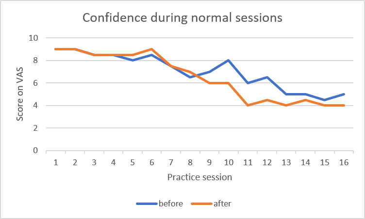 As becomes clear from the above figure, also here a striking pattern is visible. Compared to the imagery sessions, confidence levels are high in the first sessions. After a few sessions, the participant becomes less confident. This is contrary to the imagery sessions where the participant becomes more confident over time. Furthermore, the pattern of the difference between the before and after the practice session is contrary to the pattern of the imagery sessions. Here, the participant felt more confident after the sessions at the beginning of the intervention, but towards the end, the participant felt less confident after the session. With the imagery sessions, this was exactly the other way around.