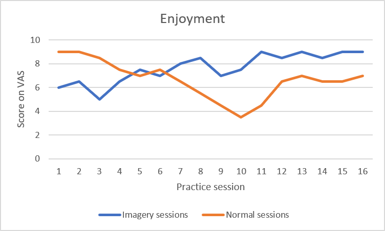 Finally, the extent to which the participant enjoyed the sessions was eventually as expected. At first, the imagery sessions were not really enjoyed but after several sessions they were more enjoyed than the normal sessions. This was as expected. The extent to which the participant enjoyed the normal sessions was much more influenced by external factors.
