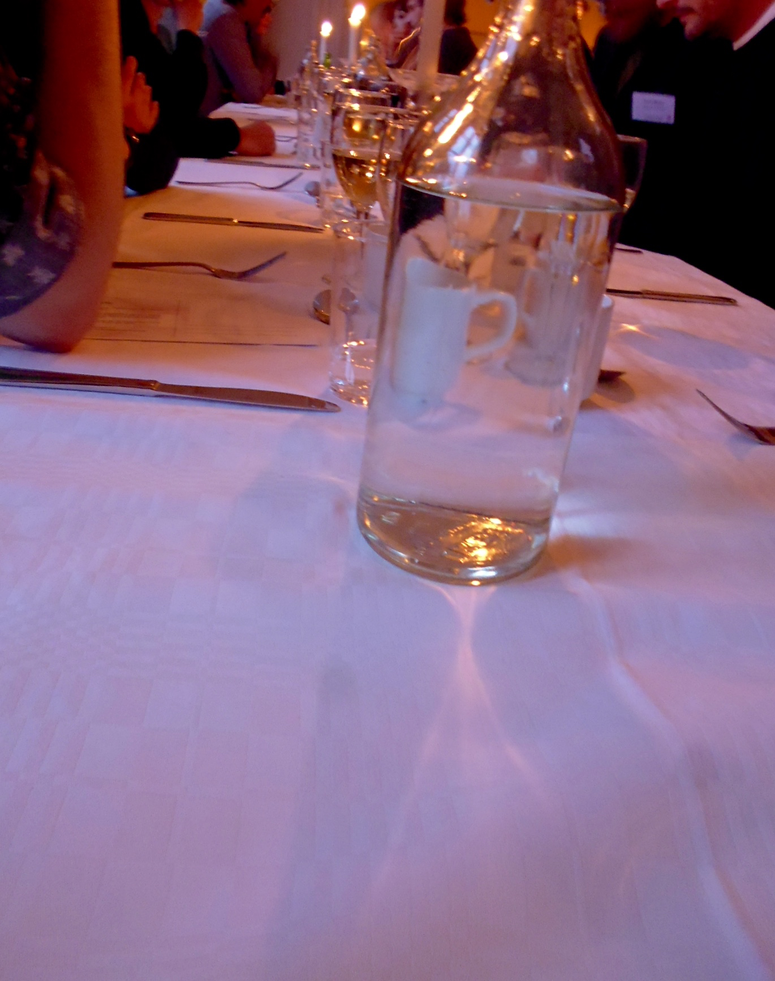 In einem Festsaal, ein gemeinsames Abendessen in einem Weißen Nacht, lauschen die Stimmen der 'baritone', 'tenor', 'soprano', betonte von 'forte' bis 'pianissimo' durch den Raum – Echodynamik.