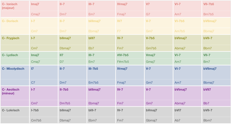 Modal interchange is the principle that you switch between different modes within a song, and you “borrow” chords from that other mode. In Figure 6 you will find an overview of the different modes, and the corresponding chord types.