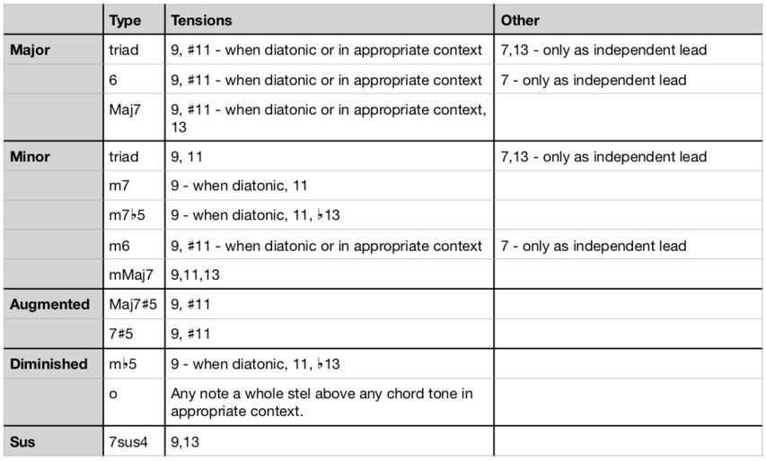 It is important that you are able to analyze your song to find the right pitches for your arrangement. In Figure 5 you will find an overview (based on information from the book “Modern Jazz Voicings”).with all the possible tensions when voicing a certain chord-type. In chapter 4 I will tell you more about certain voicings.