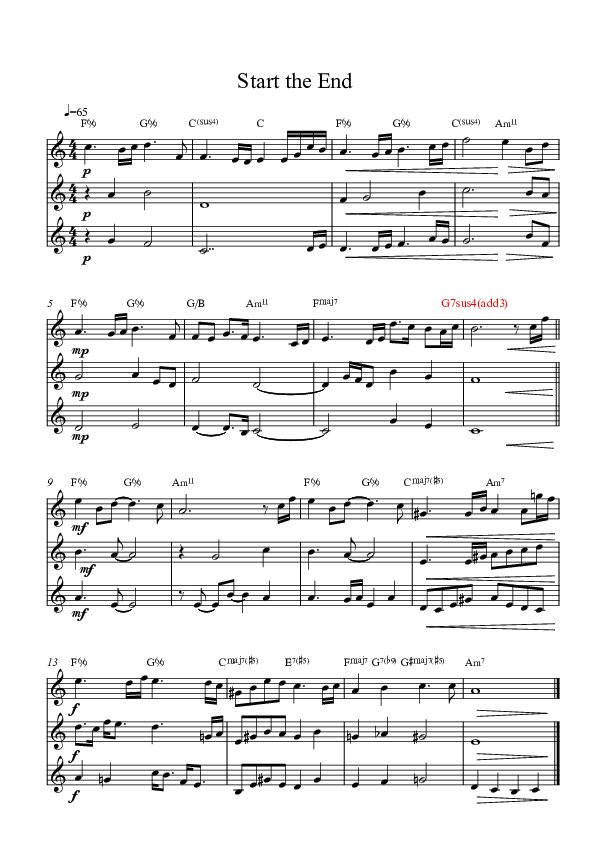 I composed the first song, Start the End, when I was analyzing the music of Kenny Wheeler and noticed that he uses a lot of modal interchange. I was not fully understanding this concept, and so I dove more into this.