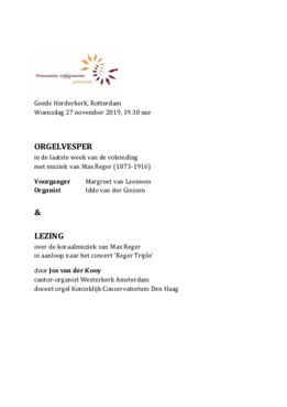 Four different styles of music were played during the vespers. As mentioned above, the first vespers was combined with a lecture on Max Reger. Reger composed a lot of appropriate choral preludes, so it was an easy choice to play Reger. In the second vespers, music by Johann Sebastian Bach was played, for his music and his many choral preludes are at the heart of the organ repertoire and remain popular among music lovers and musically interested churchgoers. The third vespers included English music, for the link with and popularity of evensong in the Netherlands, but also because the Protestant hymnbook includes many English hymns. To offer an alternative to the baroque and romantic repertoire in the first three vespers, the last one involved “meditative” or “minimal” music by Arvo Pärt and Toon Hagen, and an improvisation. The original orders of service can be found on the right. For an overview of the four vespers with English explanations, please open the PDF file from the Welcome page of this research exposition.