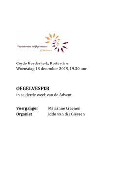 With the information provided by the Dienstboek and the examples of Rotterdam, Dordrecht and Goes in mind, an organ vespers format was designed for this research project. The vespers were to take place at the Goede Herderkerk in Rotterdam Schiebroek. The first step was to select a well-suited moment in the week for the organ vespers to take place. In consultation with the caretaker and the working group on liturgy in the Goede Herderkerk, it was decided to plan the vespers to take place on Wednesday evenings. The examples of Rotterdam, Dordrecht and Goes have the organ vespers on Sunday evenings, usually to replace regular evening services. The Goede Herderkerk has not had evening services in the past decade and it was assumed that organ vespers would attract more people halfway the working week. So for practical and organizational reasons, the Wednesday evening was chosen. The period of Advent is quite appropriate for organ vespers, since it is a period of reflection, but it also fitted the planning of this research project well. In order to have four organ vespers to observe and compare, it was decided to start the series of organ vespers on the Wednesday before Advent, November 27th, 2020. Furthermore, this first vespers could be combined with a lecture by main subject teacher Jos van der Kooy on composer Max Reger, as an introduction to the concert on the following Saturday with music by Reger. All vespers started at 7.30 pm and lasted about half an hour.