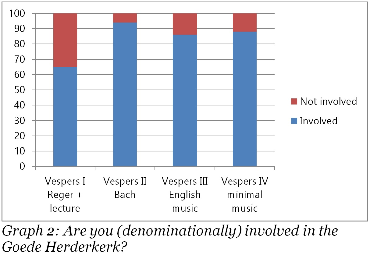 The results on the second question further support the hypothesis that most attendants are engaged with the Goede Herderkerk. As mentioned before, the first vespers was combined with a lecture on the music of Max Reger. The vespers was effectively a prelude to the lecture, since, by design, it included music by Reger. People who came for the lecture and therefore attended the vespers were in part congregation members and in part organ music lovers in general. This explains why 35% of the people at the first vespers answered that they were not involved in the Goede Herderkerk, which is considerably more than the 6-14% in the other three vespers. In sum, the answers to the first two questions demonstrate that a large majority of the attending people are congregants in the Goede Herderkerk.