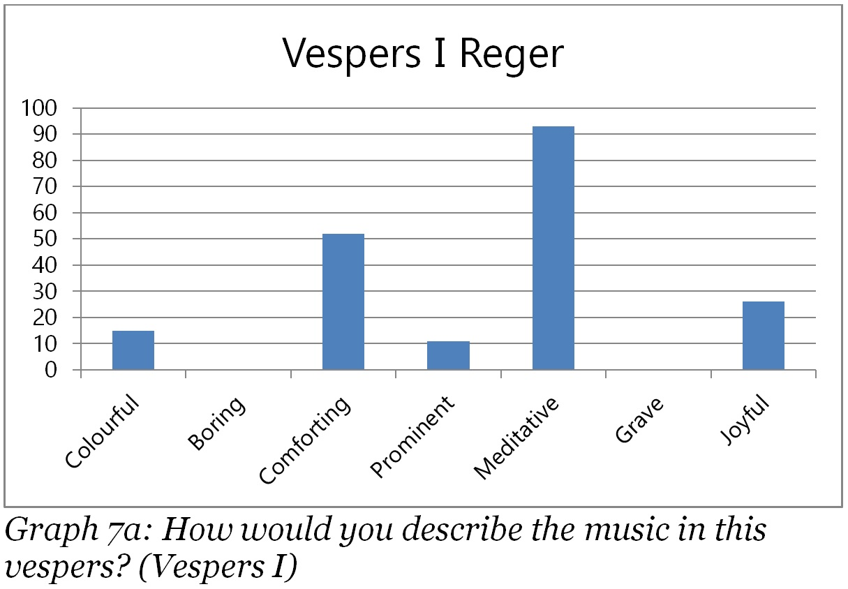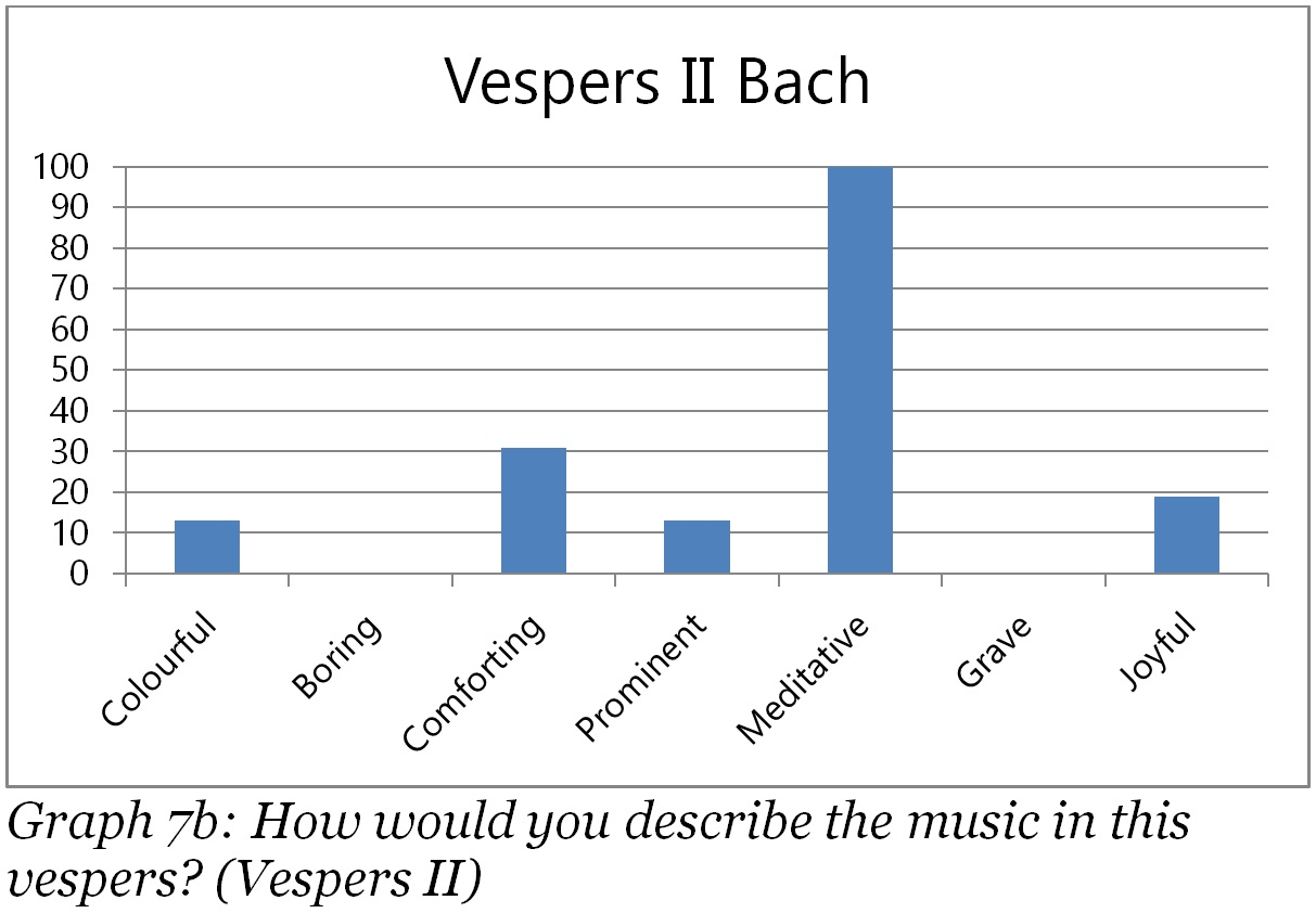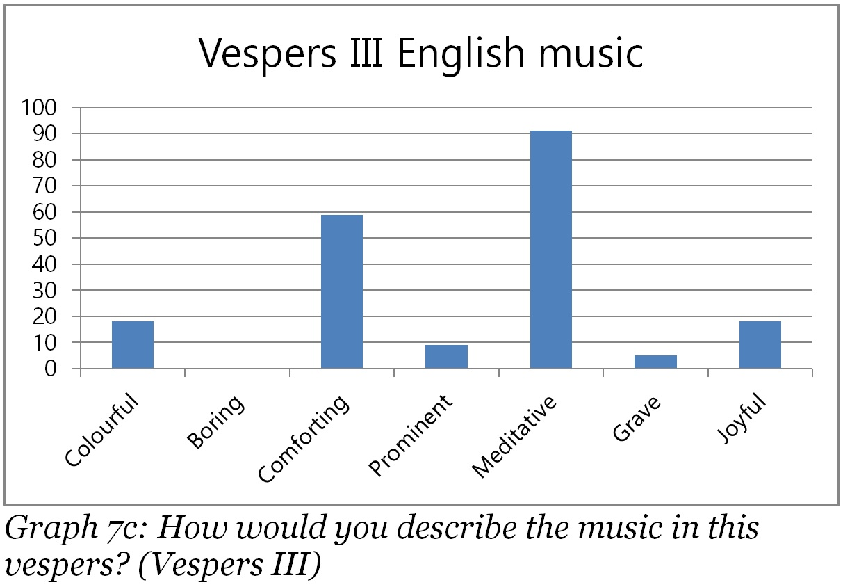 It is striking how the music was experienced as meditative by respectively 93%, 100%, 91% and 88% of the respondents. This outcome matches well with the 80% of the people who mentioned “reflection” as reason to join the vespers, and can be explained by two factors. First, the setting of a vespers itself might be described as meditative. As became clear in chapter II, vespers typically focus on stillness, prayer and reflection. The vespers studied were held in the dark evenings of November and December. There was silence in the beginning, middle and end of the vespers and evening hymns were sung, which all contributed to a subdued and quiet atmosphere. The second factor is a result of the first, for the music chosen for the organ vespers as type of evening prayer is logically meditative in nature. All organ pieces were rather subdued, with moderate tempi and performed with only a handful of registers. Following the observations and guidelines as mentioned in chapter II, the music was meant to offer reflection. The fact that the music in all vespers was described as meditative by a large majority can thus be explained both by the setting of the vespers as well as the purposely meditative character of the selected pieces of music.