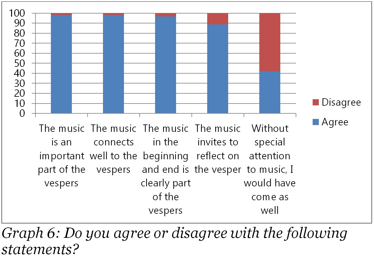 The first five questions were aimed at mapping the background of the attendants and their motivations and engagement in general. The sixth question focused specifically on the role of the music in the vesper, by posing five statements that people could agree or disagree with. The vast majority of the people agreed with the first three statements, once more confirming how the attendants valued the music in the vespers. It was seen as an important and well integrated part of the service. Once again it must be stressed that it is probable that the group sampled treasured music and came in part for the music to the organ vespers. Still, the numbers overwhelmingly confirm the added value of music in the vespers.