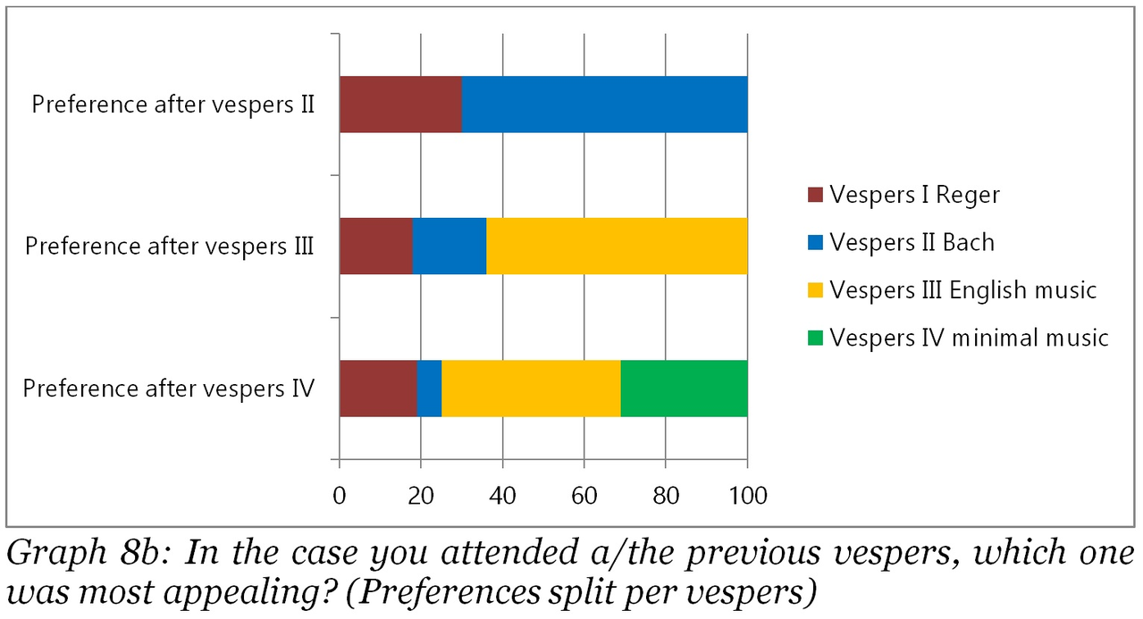 Graph 8b: In the case you attended a/the previous vespers, which one was most appealing? (Preferences split per vespers.)