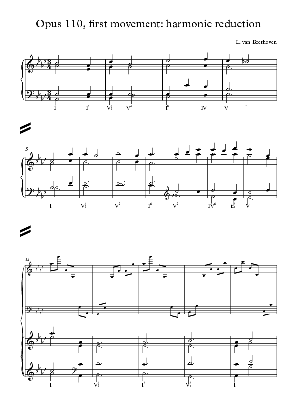 Preparing a harmonic reduction is often the beginning of an analysis for me. As Caplin argues, the harmony is crucial for determining formal functions in within the Classical style.1 And even in this piece of late Beethoven, this approach seems very valuable to me. These reductions provide insight into the important harmonic processes such as cadences, sequences and modulations. Myself and other pianists often express that an understanding of harmonic and formal structures can also be a great aid in the act of memorization.2 Especially within the sonata form it provides an insight in the different harmonic processes in, for example, the transitions of expositions and recapitulations.