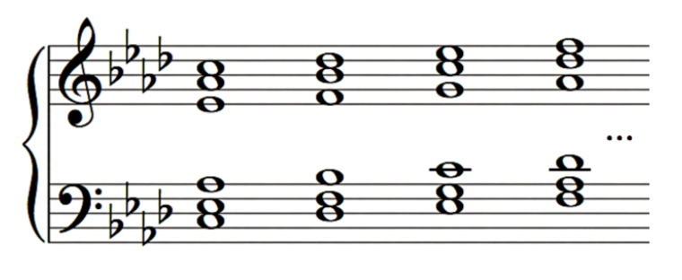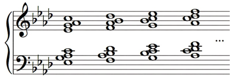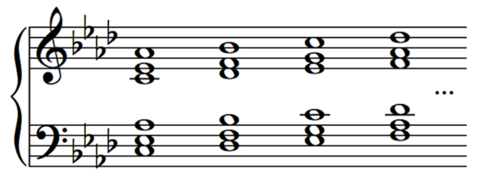 Triads: parallel triads in root, first and second inversions (hands separate and hands together). For example: