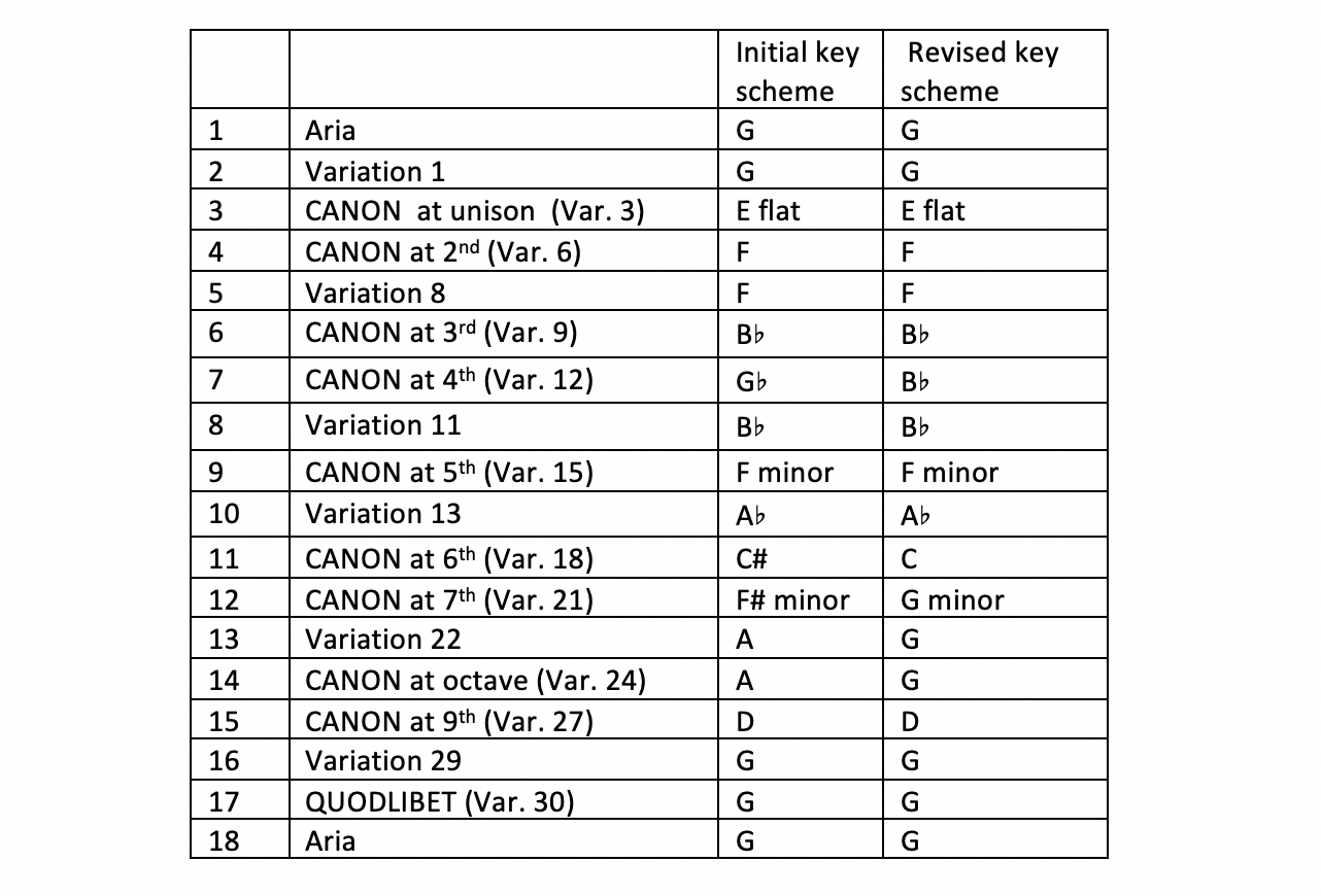 The work is perfectly successful with all the variations in G as Bach wrote them. In fact Charles Rosen has even referred to it as “the most successful of all his [i.e. Bach’s] works in concert performance today” (2012, p. 217) and, one might add, probably on CD as well. Why would one contemplate interfering with the composer’s form – both the number of variations and their keys - when it works so well? On the other hand, one might ask whether one should be forbidden to experiment with alternatives even in a successful work. Jeremy Denk (2012) has identified several of what he calls the work’s “fatal flaws”, the first of which being “Too much G major.” He writes “No amount of artistry and inspiration … can make you forget that you are hearing 80 minutes of G major; it’s like trying not to notice Mount Everest.” (See here) As is obvious from his title, his comments were tongue-in-cheek of course but I felt that there may be an underlying point that warranted some more serious consideration.