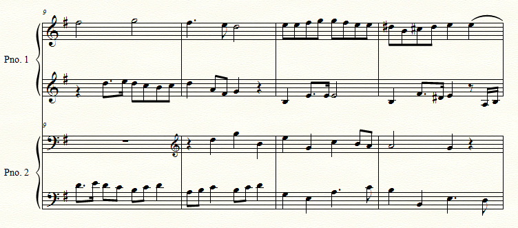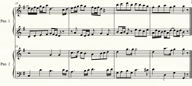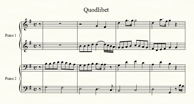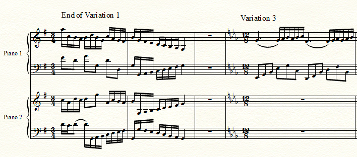 In my arrangement the canons are closest to being transcriptions – that is, Bach’s notes were distributed between the two pianos without any additional lines.[10] The two variations where I had added most additional lines were the first variation and penultimate one (Variation 29), that is, immediately before the final Quodlibet. So the symmetry of keeping those two in the new version appealed and was retained. To establish the tonic key at both ends, they (plus the Quodlibet) were all kept in G major. But, with that decision made, there was only room for four more variations to be included. We had some tough decisions to make.