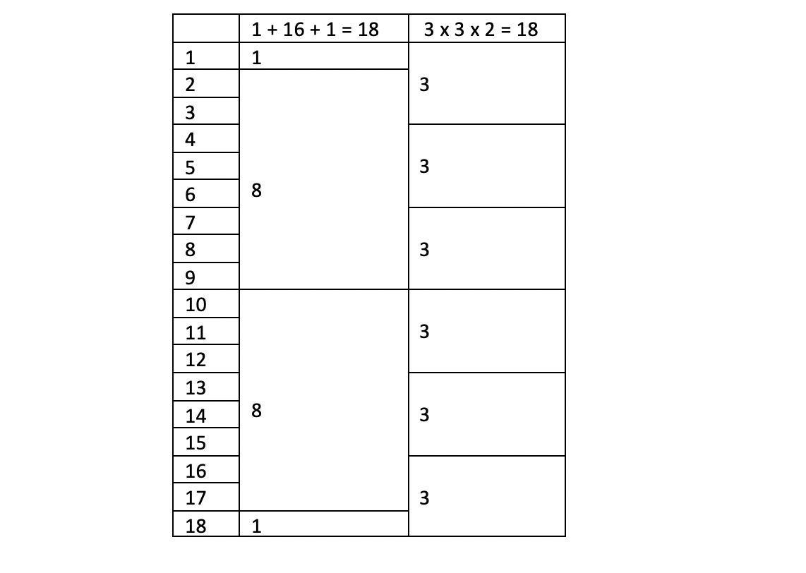 Which other numbers would allow comparable structural counterpoint? As alternatives we considered 26 (which is both 1 + (4x3) + (4x3) + 1 and 1 + 8 + 8 + 8 + 1) and 22 (1+ (10x2) +1) but, even if choosing variations of shorter duration, they both would have been too long. We also considered 20 (1 + 9 + 9 + 1 and 1 + (3x3) + (3x3) + 1). In the end 18 was decided on as the best option partly because its potential subdivisions into units divisible both by 2 and 3 (1 + 8 + 8 + 1 and 3x3 + 3x3) together with the realisation that that any more than that would probably exceed the available time and not meet the central challenge we had set ourselves.