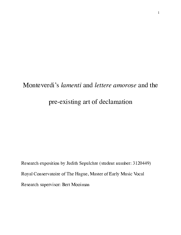 « Should the interpretation of Monteverdi’s lamenti and lettere amorose be closer to the pre-existing art of declamation? » Nowadays, Monteverdi has become so sacred to the Early musician, that we are afraid of disturbing his art in our interpretation of his written down musical lines. So we stick to what is written, respecting every pitch, every note value, and God forbid we change the tactus! For a lot of Monteverdi’s music, this is a respectable approach. However, when it comes to the interpretation of his lamentations (lamenti) and love letters (lettere amorose), one asks themselves whether it should perhaps be done in a more declamative way. These two genres are composed in the stile recitativo and carry so much unrepeated text that it seems almost improbable that one should approach these compositions from the notes rather than from the poetry. If the seconda pratica is the beginning reign of the text over the harmony in the composition process, then why not adopt this same concept in the interpretation process? Throughout this research, I will first observe the historical context of these two genres and their connections with the world of the Commedia dell’Arte. I will then discuss the very delicate question of the tactus. And finally, I will attempt to interpret a couple of Monteverdi’s compositions, basing myself on the declamation skills of a Commedia dell’Arte specialist with whom I worked closely.
