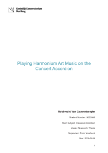 The harmonium and the accordion are two similar instruments working via the same core principles: free-reeds and bellows. Despite this commonality, the harmonium was popular in the late romanticism & early 20th century whilst the accordion, as a concert instrument, started to emerge only from the 1950s on; both instruments thus having a totally different repertoire. Nowadays however, it is not so easy to find a decent harmonium, let alone to come across somebody who masters its specific technique and for that reason, harmonium pieces are these days often performed on an accordion. This research will therefore try to be a guide for the accordion player who is asked to play a piece that was originally written for the harmonium, by providing him with some necessary tools and background information concerning the specifics of the harmonium. First of all, a brief history, focussing on the historical and constructional similarities and differences between both instruments, is included and besides that, the most common harmonium-types (compression system, suction system, art harmonium) aswel as the rise of the free-bass accordions are being described. The second chapter deals with the specific repertoire for the harmonium by offering a list containing the majority of the romantic literature for the instrument, written by established composers of that era. Hereby, some of the key compositions, e.g. l’Organiste by César Franck, are highlighted. A comparison between the way of playing, sound and registration of both instruments will conclude this thesis.