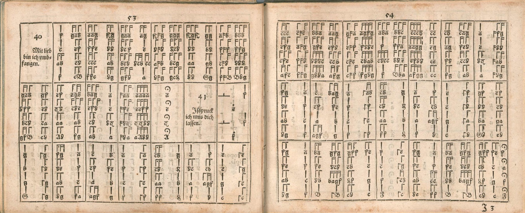In the lesson, we played 41 Isspruck ich mus dich lassen, which starts in the middle of p. 53 and should be read across the page divide to continue onto p. 54.