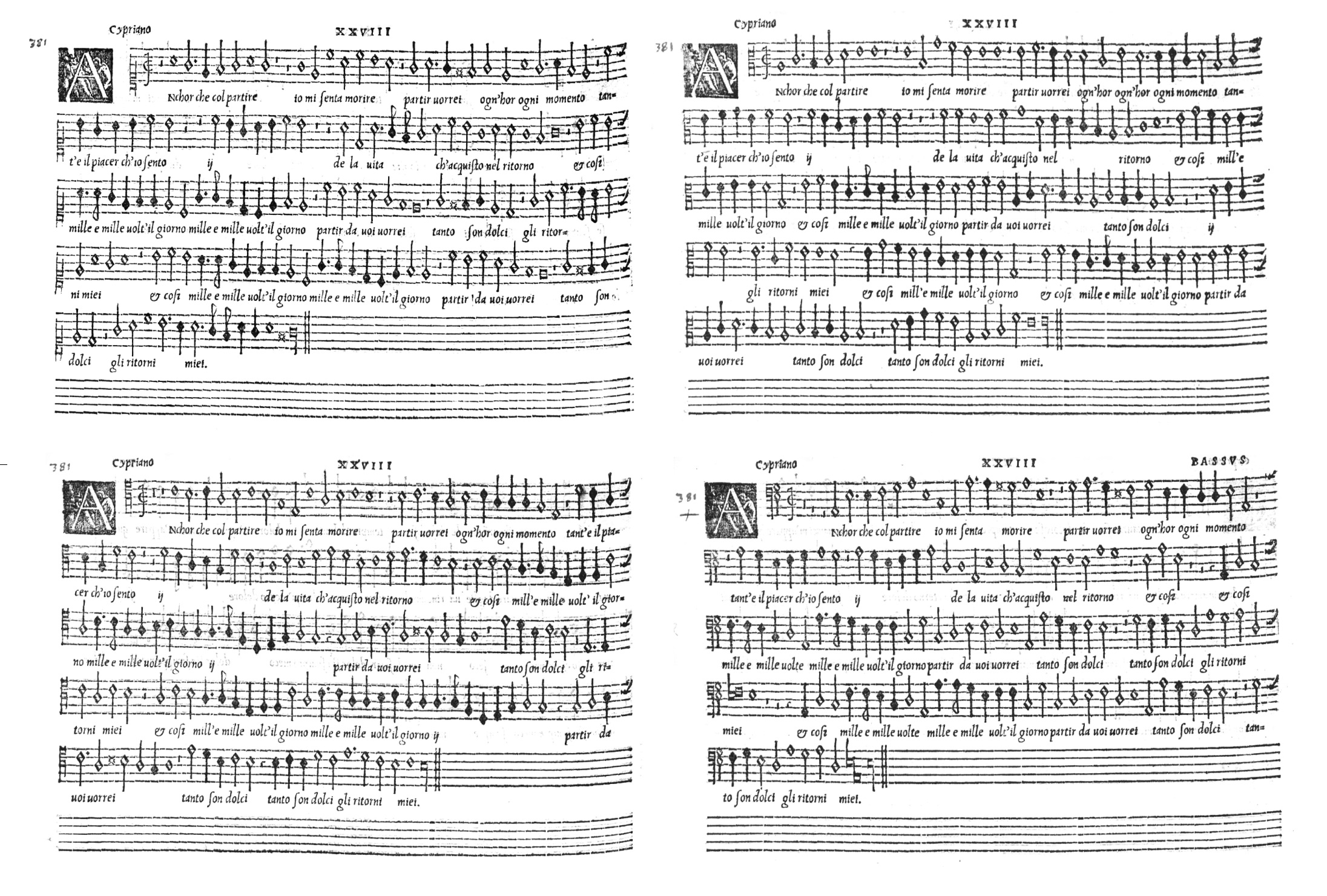The case of (2) has been realized by placing the 4 parts of Anchor che col’ partire on a virtual music desk as follows; the parts are from the 1st edition of Antonio Gardano’s Madrigali a 4 voci, Libro 1 (Venice, 1547):
