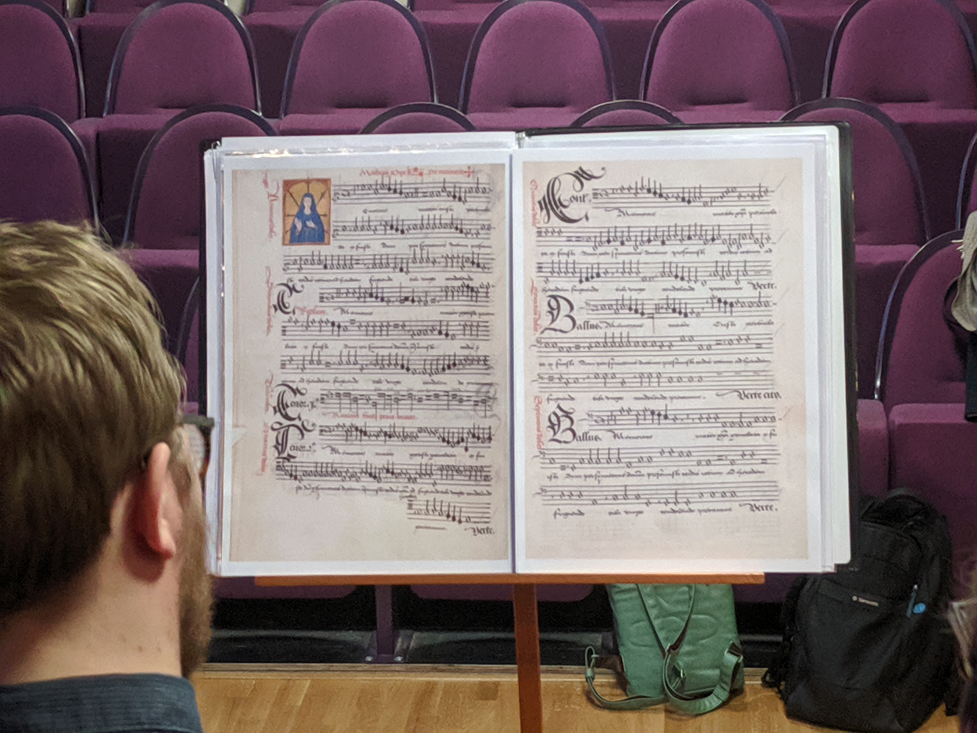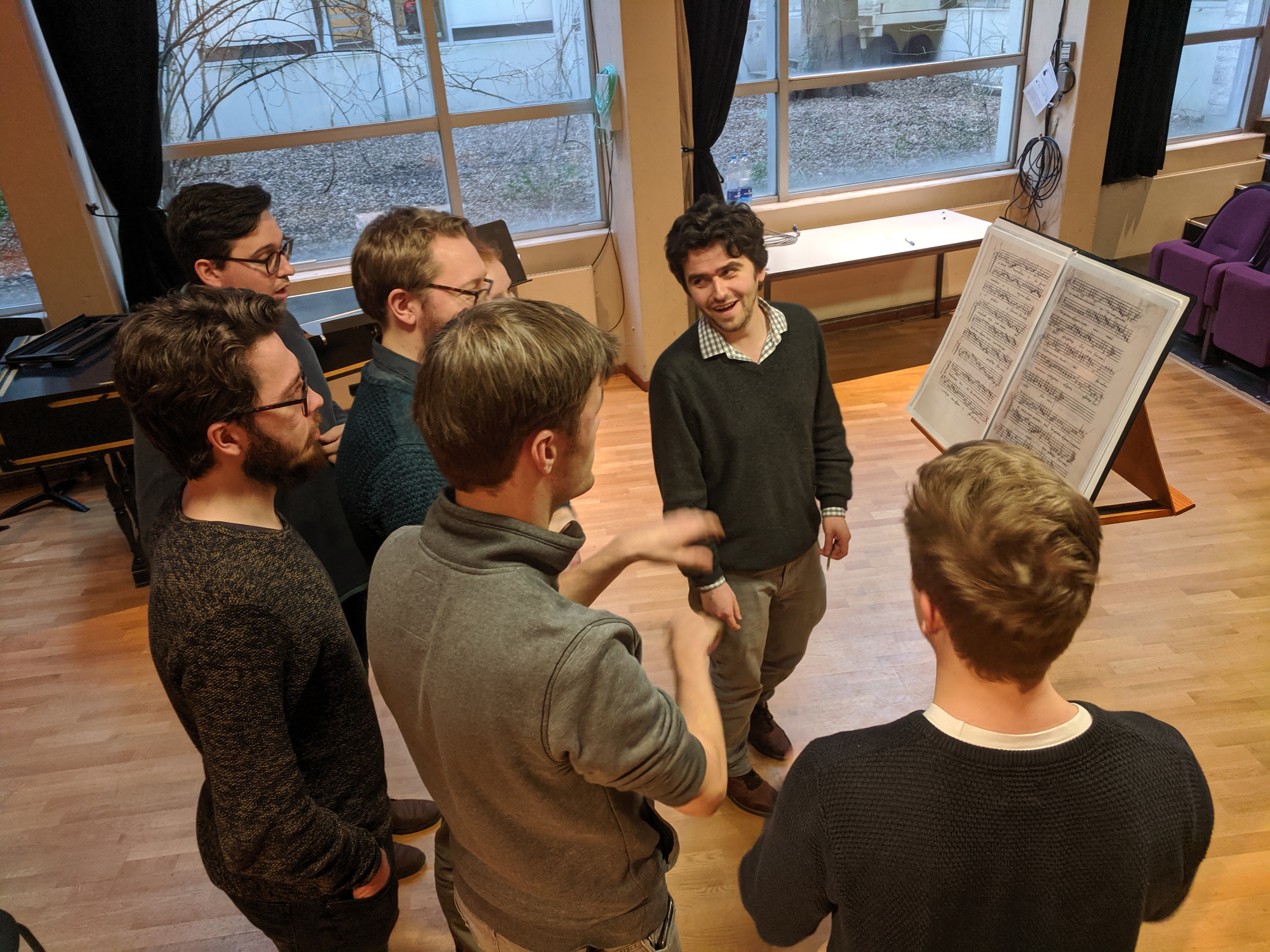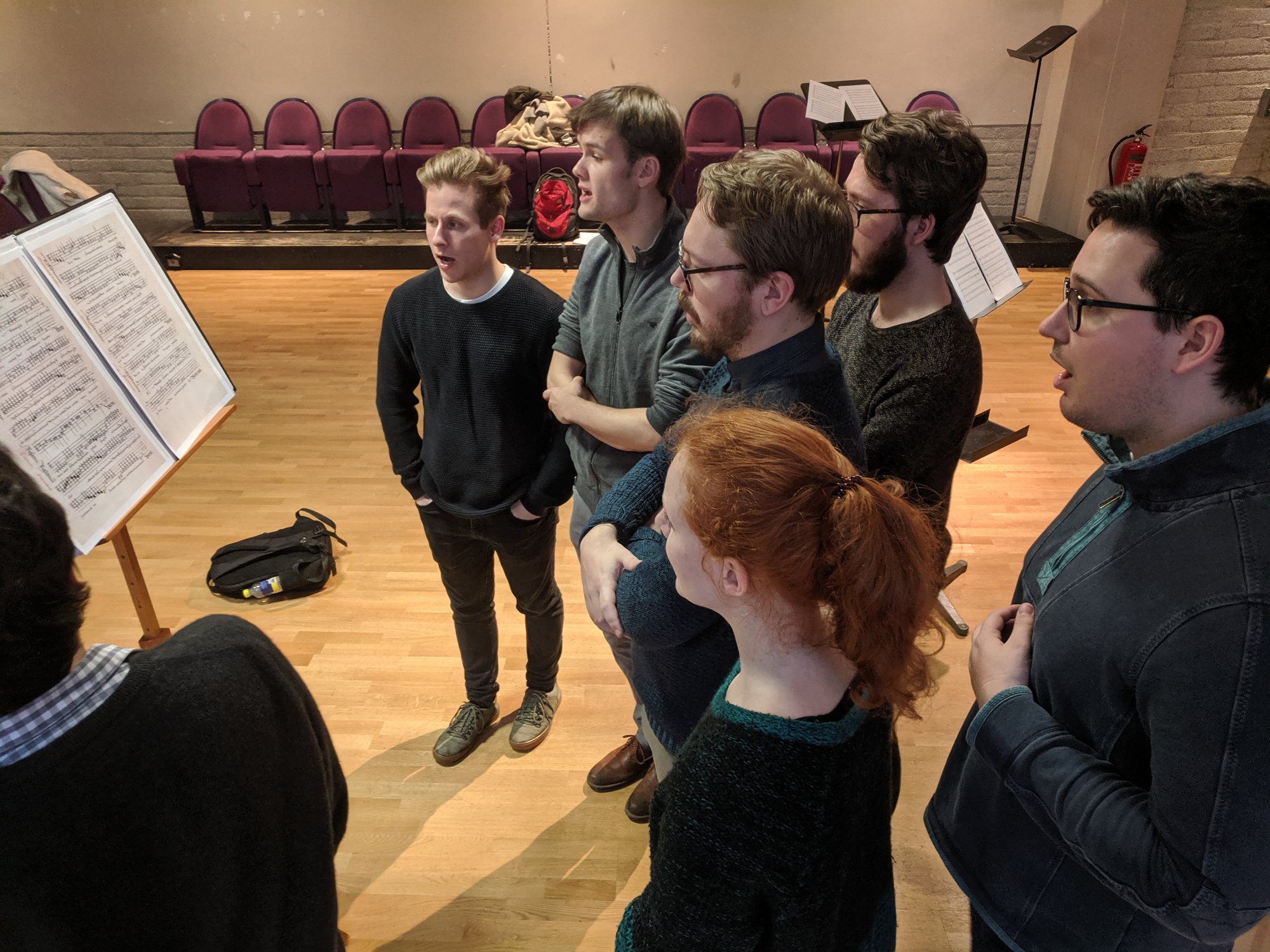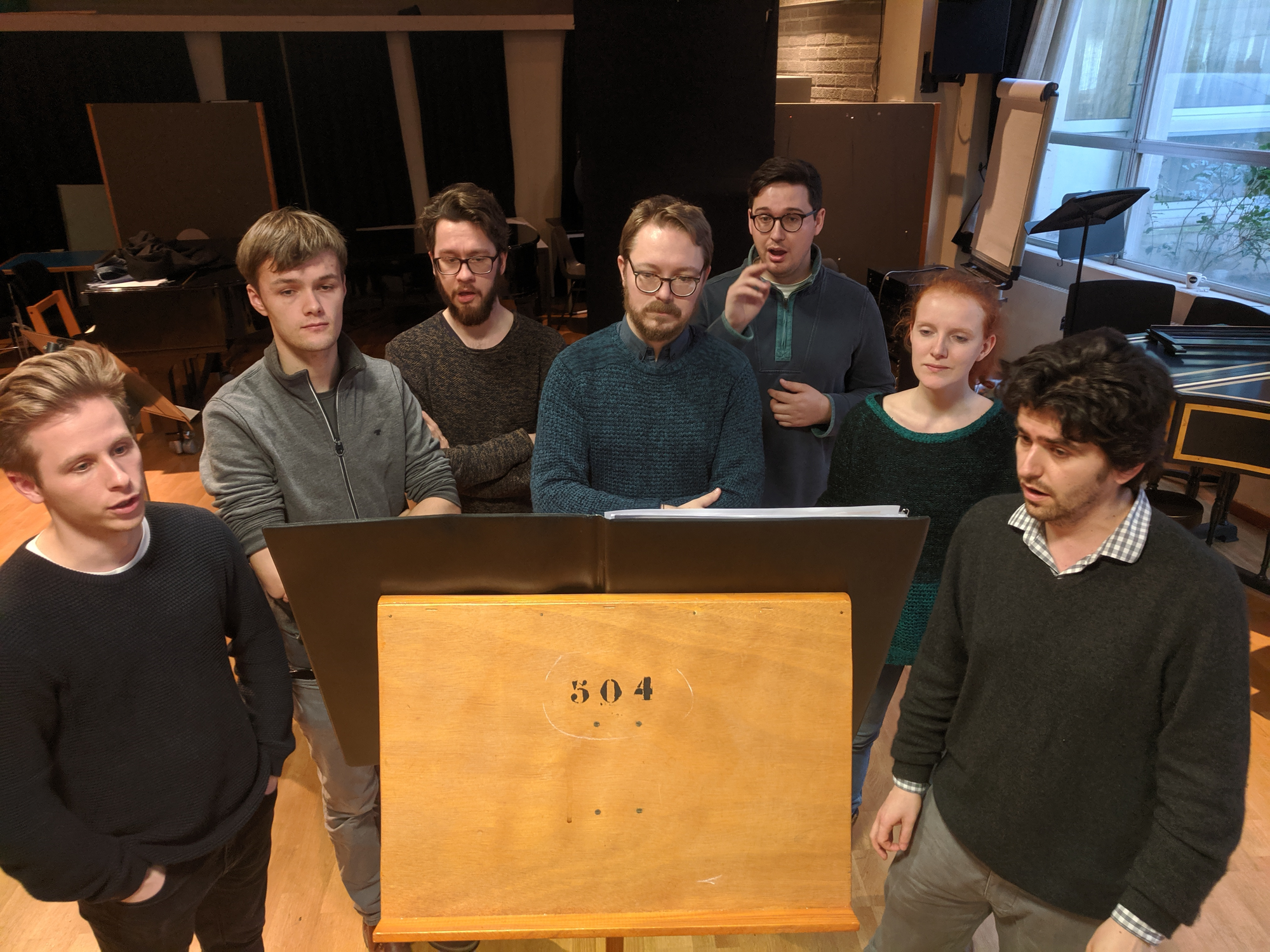 The following are images of a group of vocal students at the Royal Conservatoire, The Hague singing polyphony from parts on one music stand: