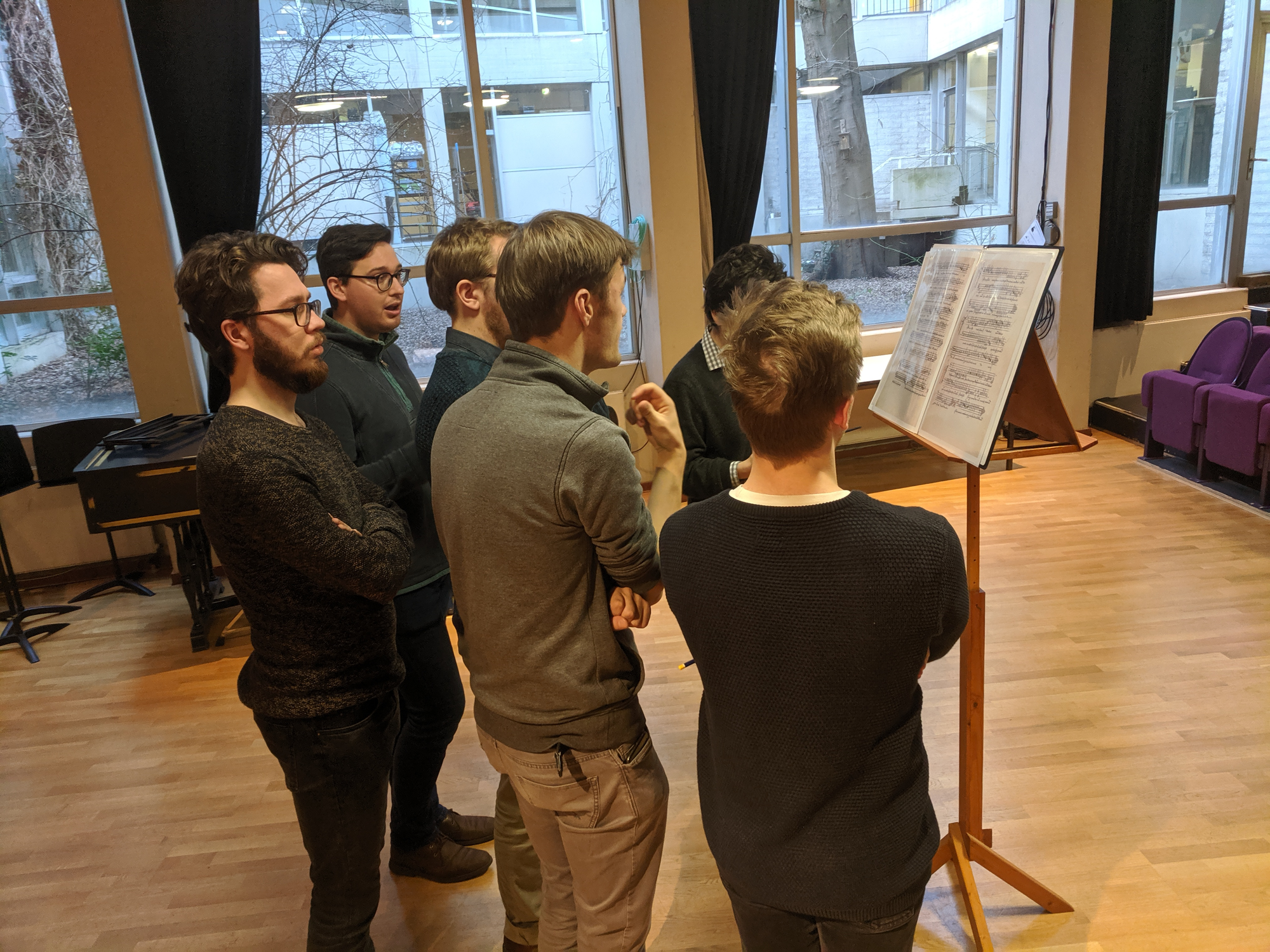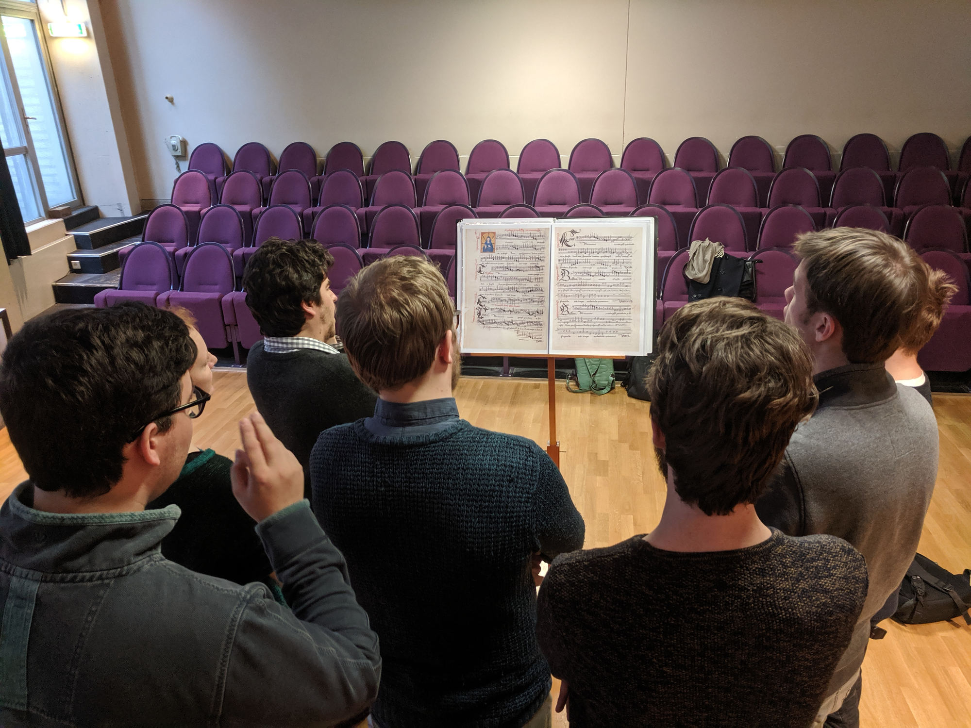 The following are images of a group of vocal students at the Royal Conservatoire, The Hague singing polyphony from parts on one music stand: