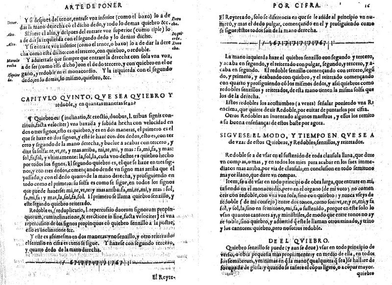 Corrêa recommends the quiebro on the 1st note when a voice enters (especially on the organ), between whole steps, on all semibreves and minims when the other voices are not too busy, on stepwise movements when the redoble does not work, and one must play the quiebro reiterado at the beginning of a large slow work. The redoble must be played on mi-fa, on the penultimate chord, at mi-fa cadences, on some whole-step movements, and on the mi at the beginning of a large work on the harpsichord.5 He also adds ideas of inequality and grouping of notes in the ‘Eleventh Point’ of the “ADVERTENCIAS”6: