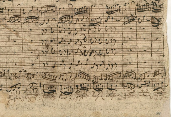 At the turn of the 17th century, the 2-staff notation became more of the standard form of keyboard notation. After tablature went out of fashion, Johann Sebastian Bach (1685-1750), who was known to have owned a copy of the Ammerbach Tabulaturbuch and draws musical training from the influences of Dietrich Buxtehude (1637-1707) and Georg Böhm (1661-1733), still used the tablature system practically in his autograph scores to scribble musical notes on the margin (i.e. the fugal theme or fragments from another page) or to notate the last few measures when he runs out of staff lines at the end of the page. The following image is just one of the many examples that shows his scribble marks from the full score of Harpsichord Concerto in F-Major, BWV 1057 (Leipzig, 1738/1739):