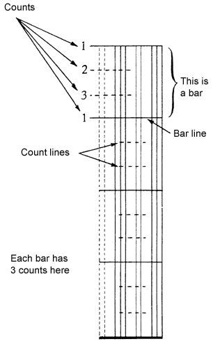 Duration and rhythm are displayed graphically in bars of equal length marked off by bar lines:1