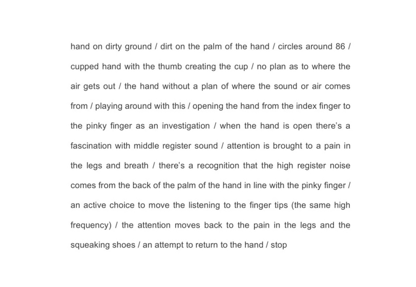 Blaha Lujza Tér is a 25-minute piece for solo performer. It is structured in two parts: in the first, the piece is performed at a great distance from the audience; and in the second, the same material is performed at a close proximity to the audience. In the video above, the sound is captured with binaural microphones and the image with a camera positioned above the performer, a perspective that no live audience would experience.