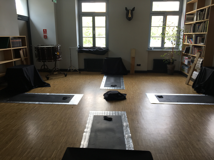 After the piece was over, I would allow the audience to lay in silence on their mats. Every group reacted so differently. Every group came in as four individuals, but a group culture was consistently created almost instantaneously from the moment the piece began. Occasionally this culture would transform through the situation of a collective experience, an understanding that as four individuals they had become a group that underwent a unique experience, one that would be difficult to share with the outside world. In these groups, their desire to lay on the mats in silence together was almost palpable. There was occasionally the feeling that no one wanted to get up for fear of breaking the precious silence that they had finally be afforded. Occasionally one or two people would continue to play, touching the instruments around their heads, or making sounds of their own invention.