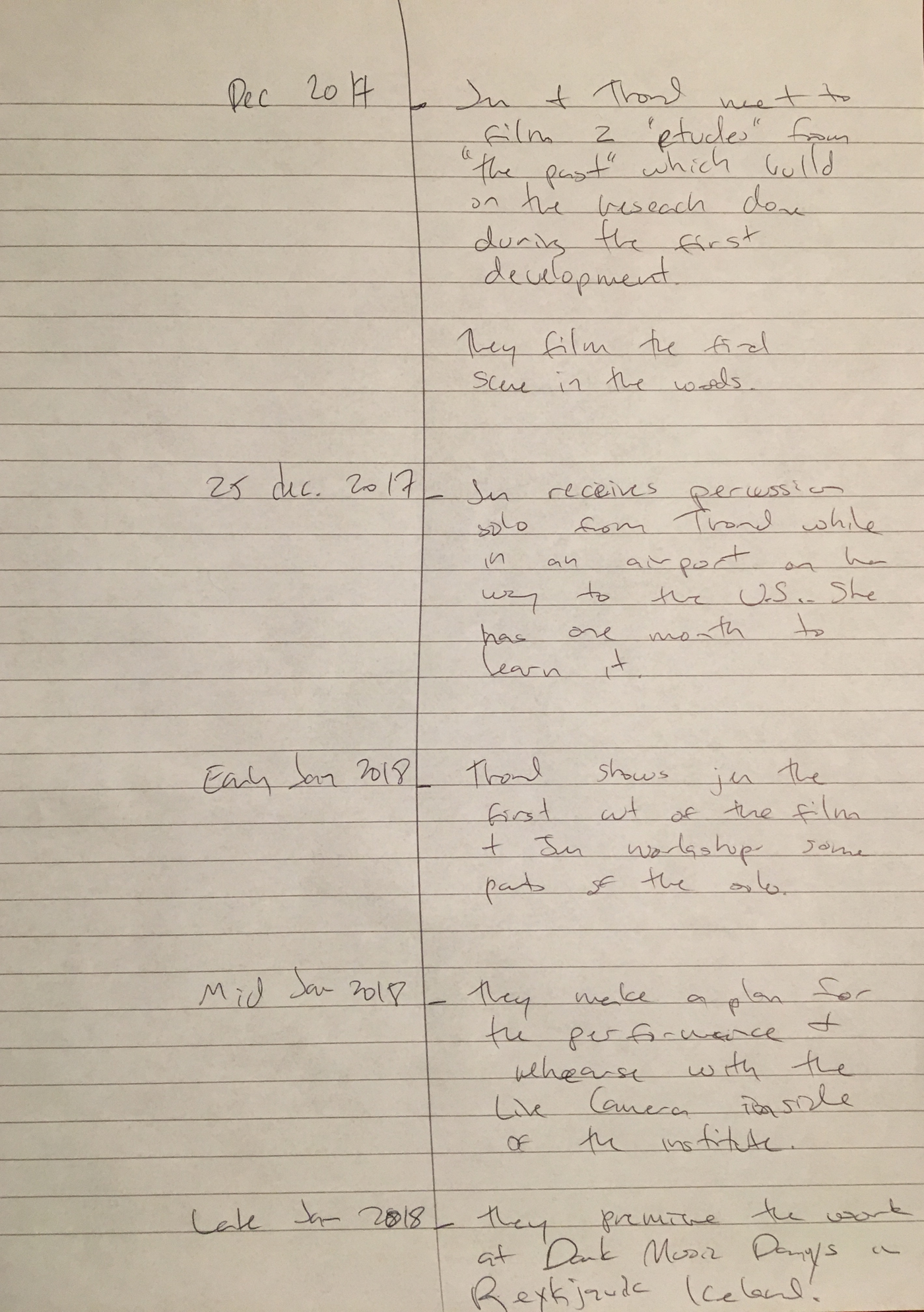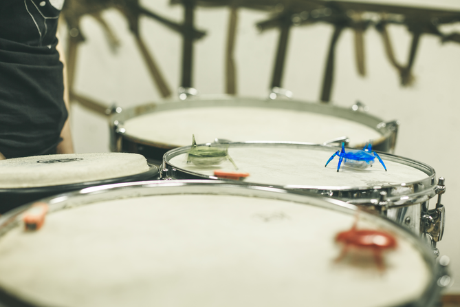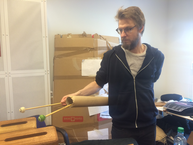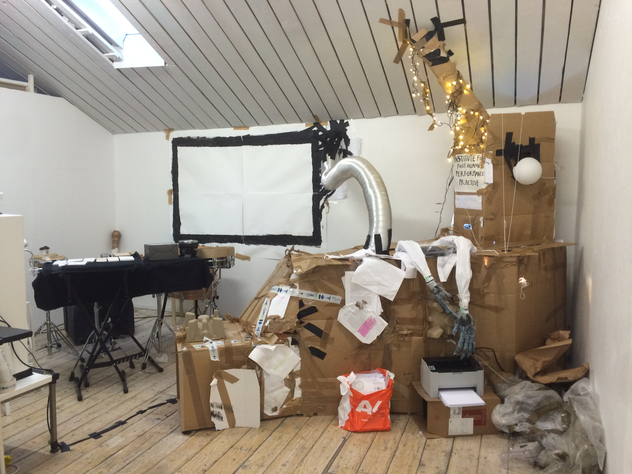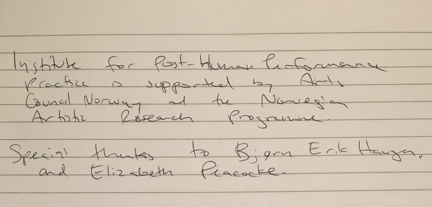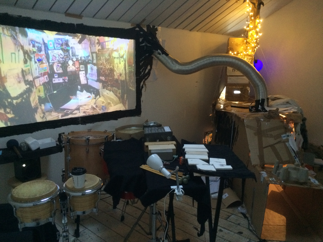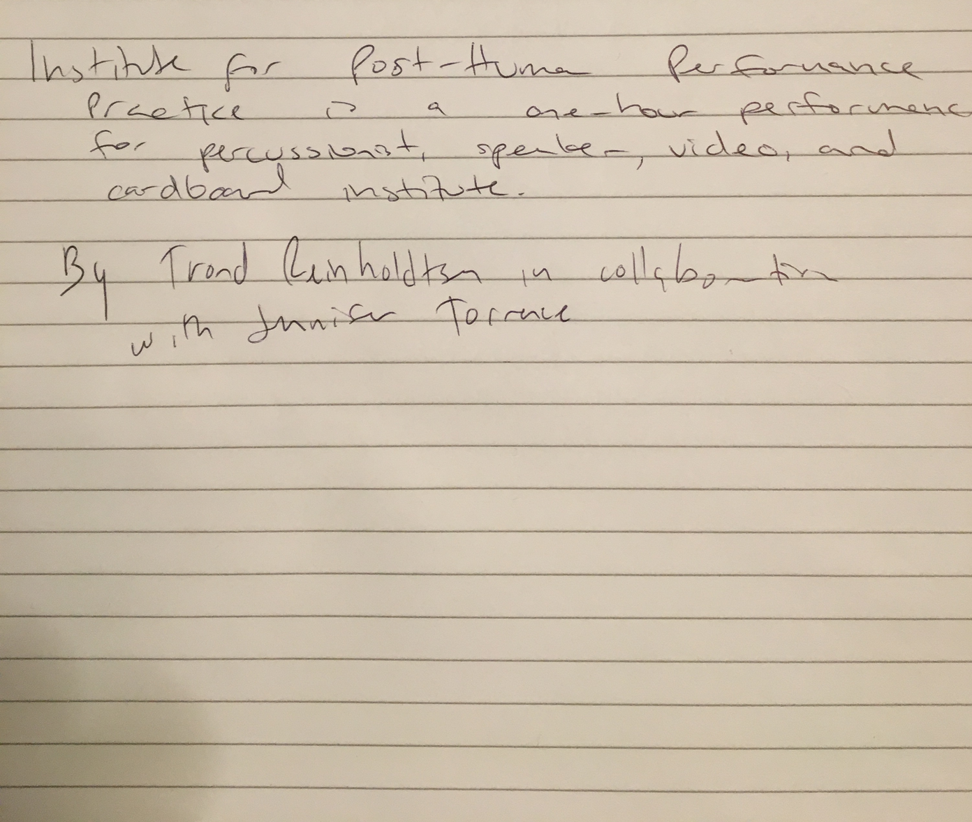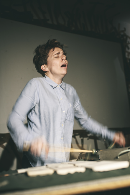 What does the musician become when sound and instrumental thinking are no longer privileged as the foundation of a musician's practice? In what ways does an emphasis on the musician's body cause music to approach art forms such as theatre and performance? After a generation of pioneering work from Mauricio Kagel, Dieter Schnebel, John Cage and many others, where is the theatrical and the performative in music today? How do its recent developments shape, alter, constitute a musician's artistic practice? Through her research, Jennifer Torrence argues that this type of music demands the musician assume a different understanding and relation to their instrument and therefore a different relation to their body. This relation calls for new ways of making and doing (new artistic practices) that foreground the body as a fundamental performance material. Through an emphasis on the body, the musician emerges as a performer. This exposition is a reflection on the research project Percussion Theatre: a body in between. This project is comprised of a collection of new evening-length works that approach the theatrical and performative in contemporary music performance. These works are created with and by composers Wojtek Blecharz, Carolyn Chen, Neo Hülcker, Johan Jutterström, Trond Reinholdtsen, François Sarhan, and Peter Swendsen. The exposition contains reflections on recent developments in contemporary music that mark a mutation of the executing musician into a co-creating performer, as well as images, artefacts, videos, and texts that unfold the process of creating and performing the work that constitutes this project. The ambition of this exposition is that through the exposure of a personal artistic practice an image of a larger field may come into focus.