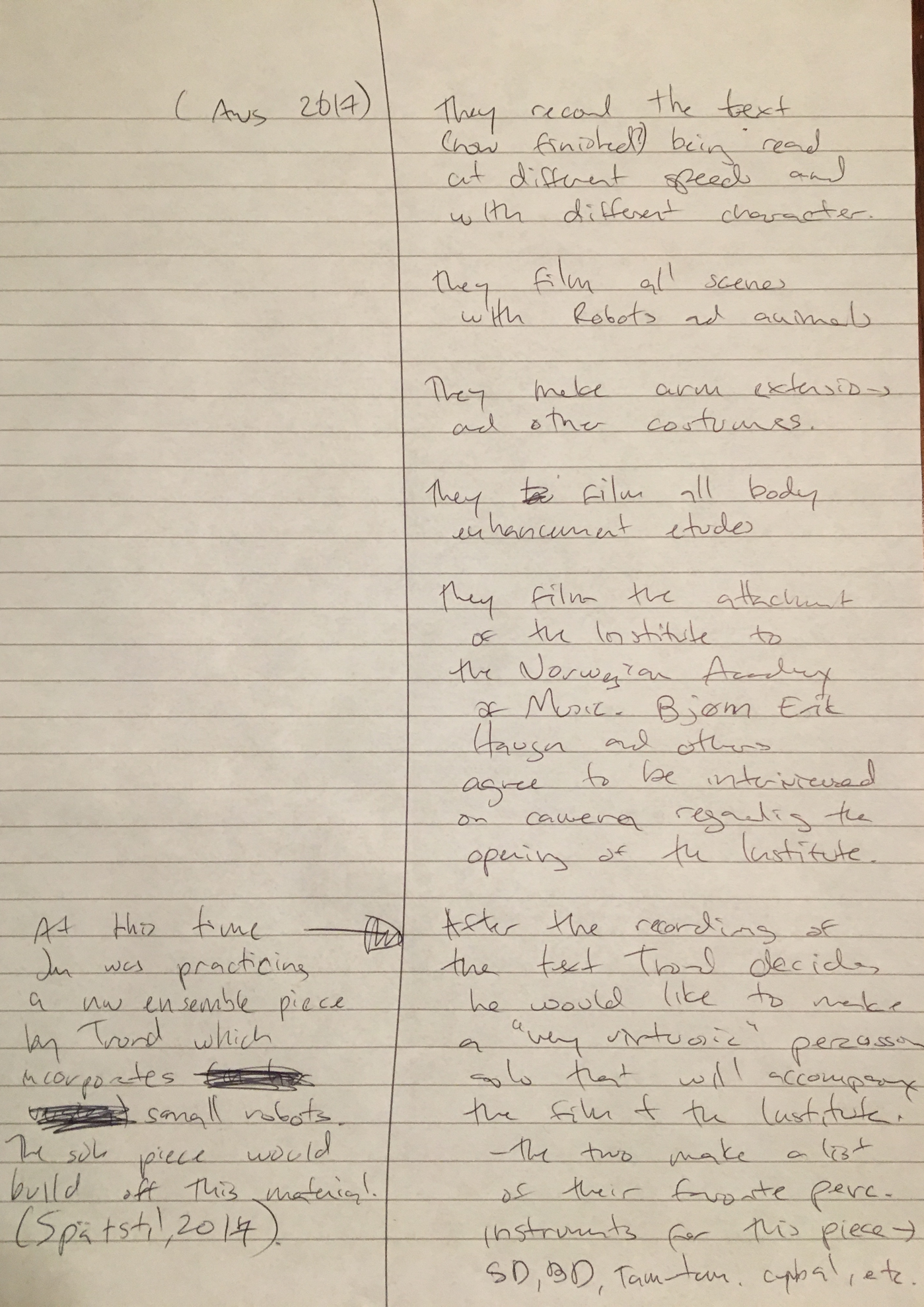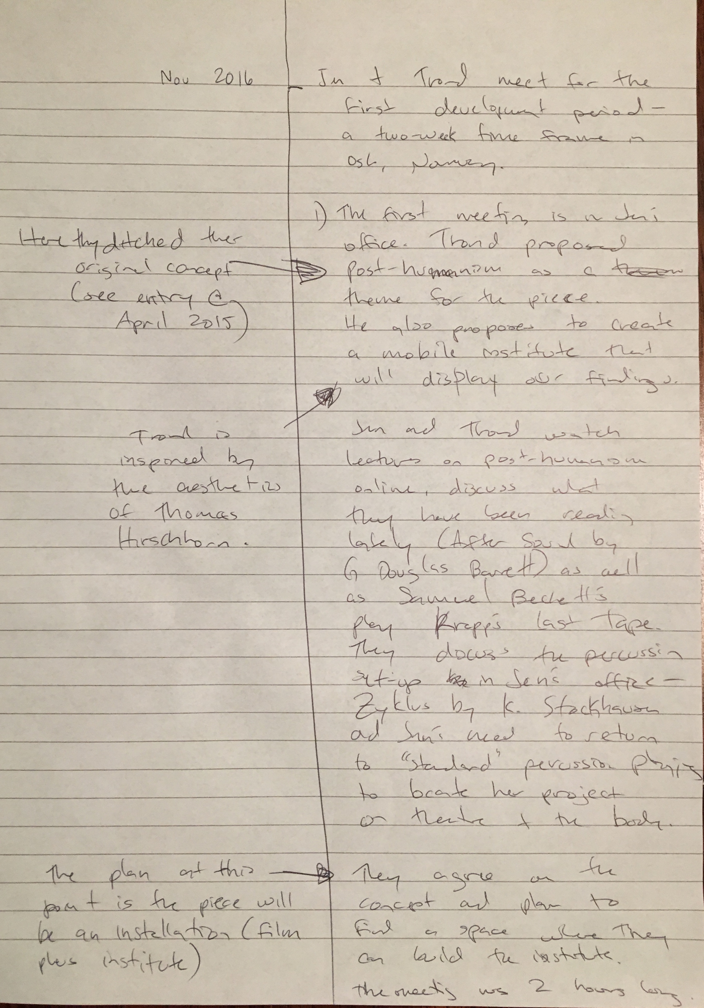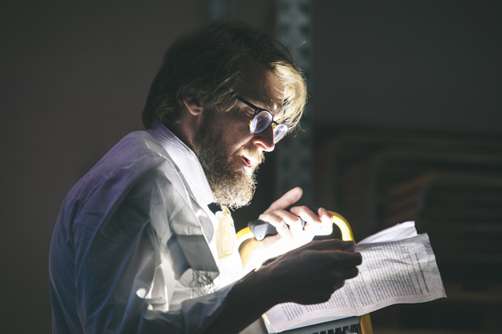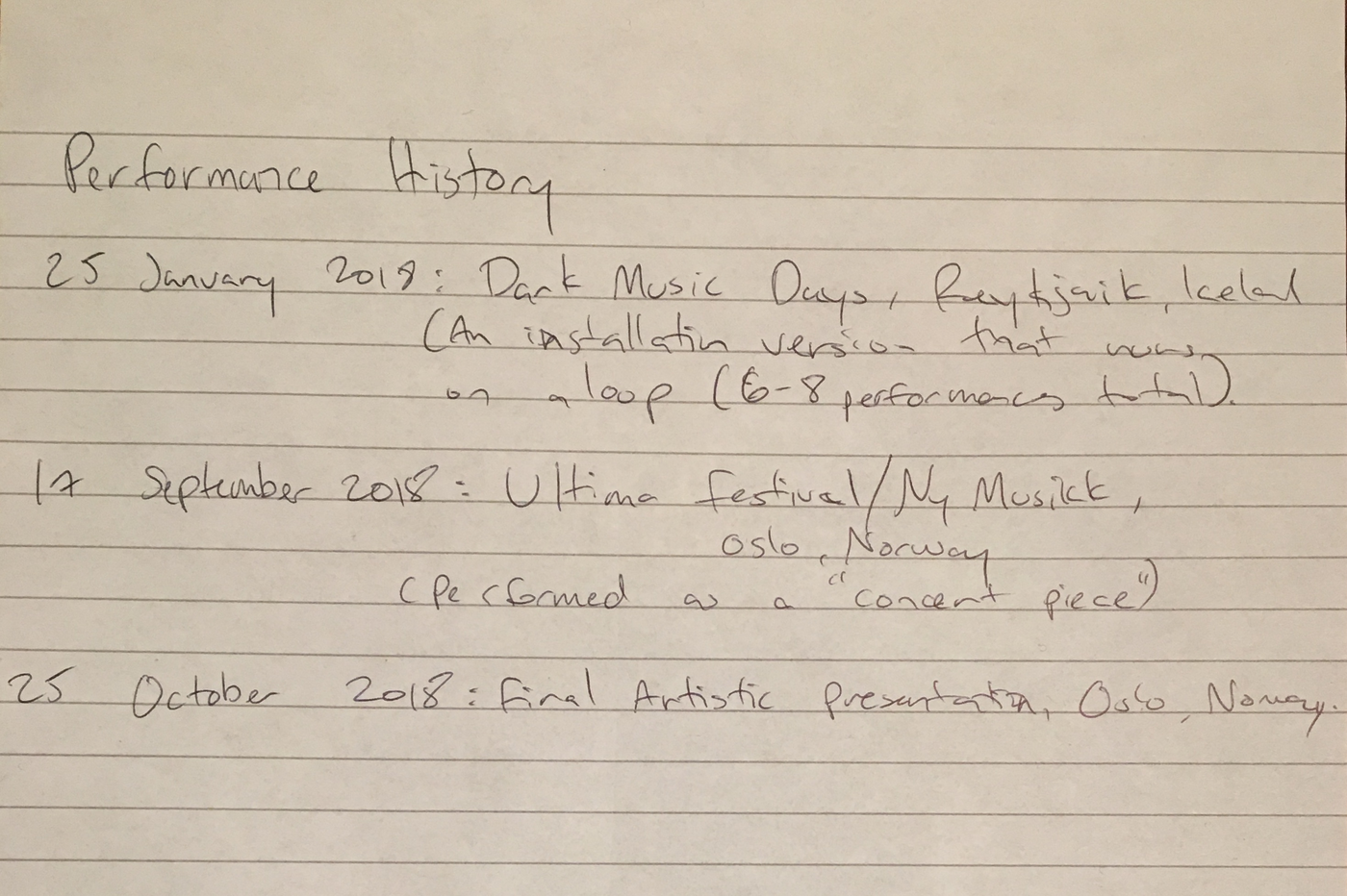 What does the musician become when sound and instrumental thinking are no longer privileged as the foundation of a musician's practice? In what ways does an emphasis on the musician's body cause music to approach art forms such as theatre and performance? After a generation of pioneering work from Mauricio Kagel, Dieter Schnebel, John Cage and many others, where is the theatrical and the performative in music today? How do its recent developments shape, alter, constitute a musician's artistic practice? Through her research, Jennifer Torrence argues that this type of music demands the musician assume a different understanding and relation to their instrument and therefore a different relation to their body. This relation calls for new ways of making and doing (new artistic practices) that foreground the body as a fundamental performance material. Through an emphasis on the body, the musician emerges as a performer. This exposition is a reflection on the research project Percussion Theatre: a body in between. This project is comprised of a collection of new evening-length works that approach the theatrical and performative in contemporary music performance. These works are created with and by composers Wojtek Blecharz, Carolyn Chen, Neo Hülcker, Johan Jutterström, Trond Reinholdtsen, François Sarhan, and Peter Swendsen. The exposition contains reflections on recent developments in contemporary music that mark a mutation of the executing musician into a co-creating performer, as well as images, artefacts, videos, and texts that unfold the process of creating and performing the work that constitutes this project. The ambition of this exposition is that through the exposure of a personal artistic practice an image of a larger field may come into focus.