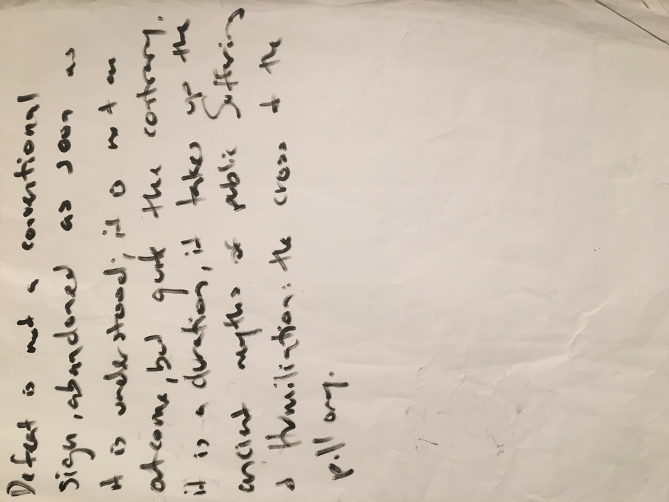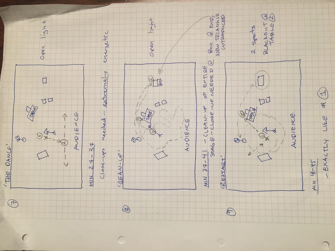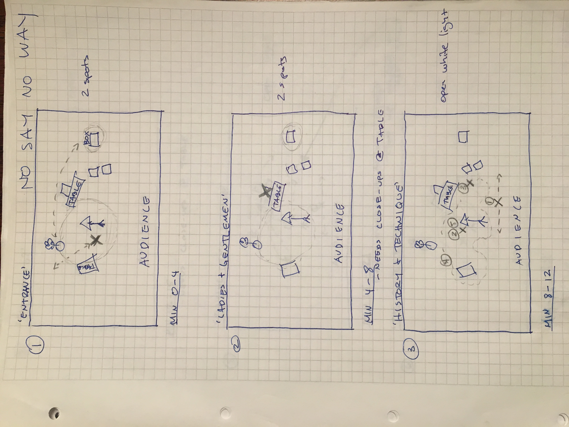 No Say No Way was created through a highly collaborative process whereby the entire piece was created “in the room" across the span of two weeks. It was created in a method similar to theatre or dance, where Sarhan directed and tested ideas through the body of Torrence via improvisation and gameplay. The starting point was to begin with no instrument beyond the body. Only selected sections are scored in a traditional method, the remainder are text instructions. The piece underwent several rounds of revisions across the span of nine months of performances and via coachings with theatre practitioners. These revisions included adding new sections, adding a voice playback (performed by Sarhan), and developing the lecture texts through the integration of hand gesture.