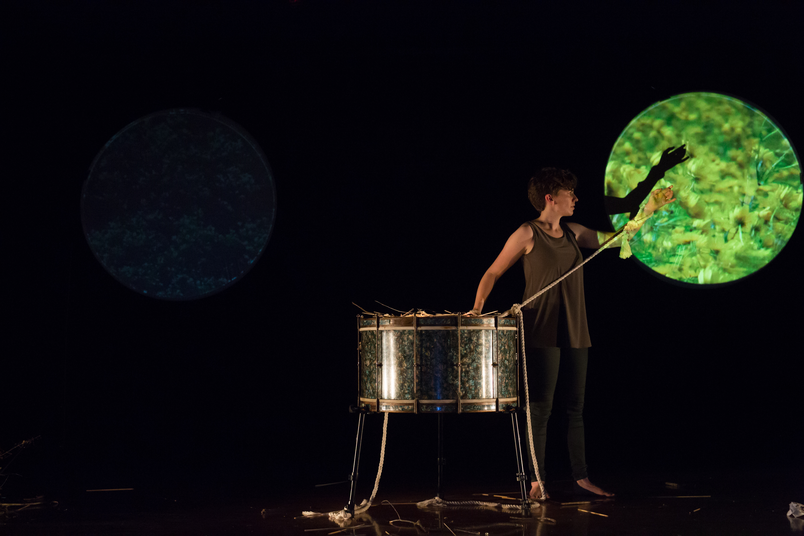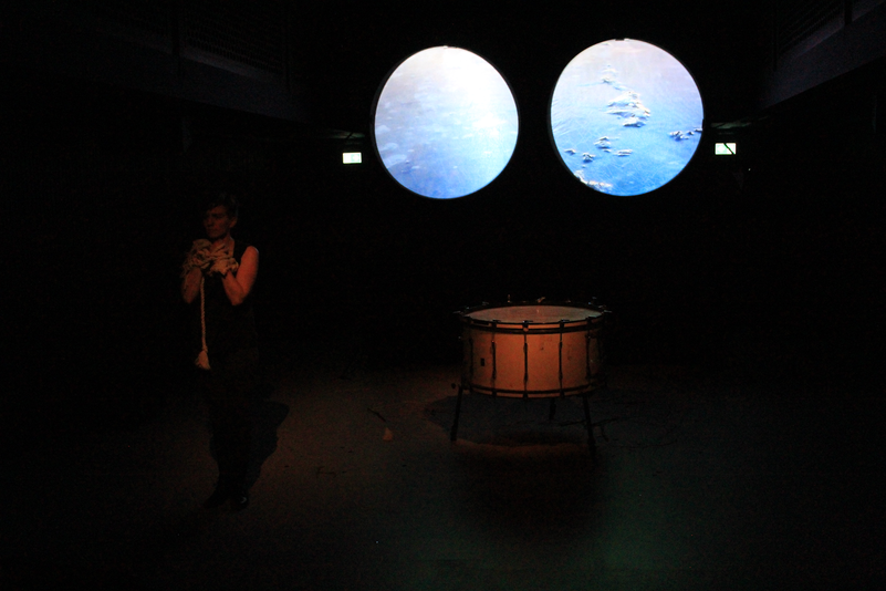 - The live performer inhabits (or is inhabited by) a number of roles: characters from the play, the nature of the island, her own character as visitor to the island. Her performed sound, movement, and vocals serve all of these roles.