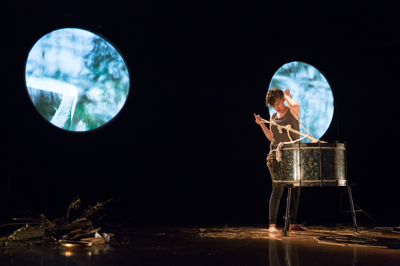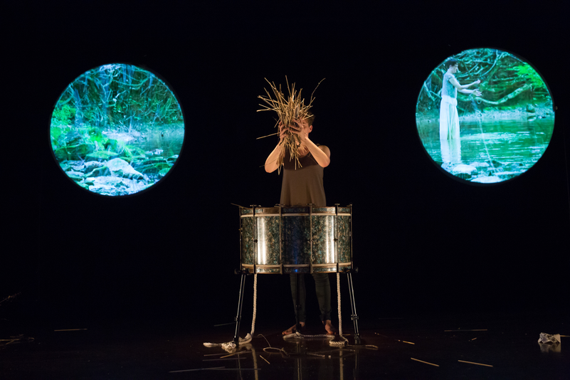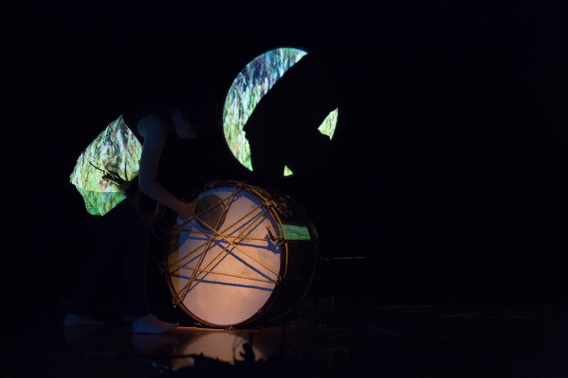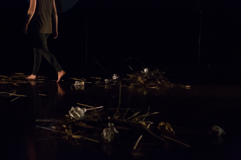 What Noises Remain was created through a highly collaborative process across two years. The starting point was to reimagine The Tempest via storytelling strategies using objects, the body moving in space, and multi-media elements. First, Swendsen and Torrence re-constructed the text through various strategies; second, the video material was collected and structured by Swendsen and Torrence; third, the audio playback material was collected and structured by Swendsen; lastly, the performance material and staging were created through devising methods. The piece’s score is text instructions that follow a timeline. The piece underwent one major revision in 2017, which largely affected the staging and scenography. This is the first piece within the project where the composer offered to share authorship with Torrence.