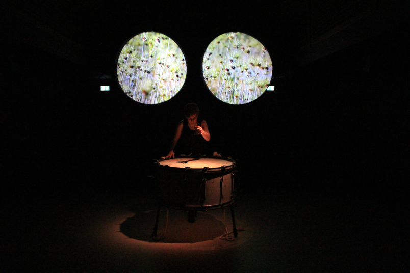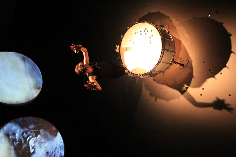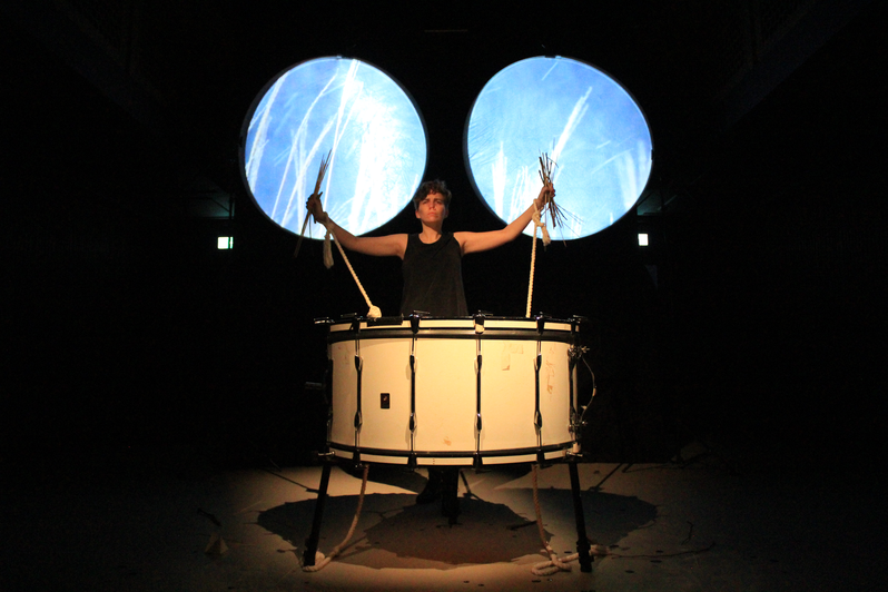 - At the moment, we are thinking that one video will be projected on to the bass drum surface (and perhaps the area surrounding). A second video, sometimes split into two distinct images, would appear behind and above Jen. The frames for this video may also be circles (like binoculars). The screens themselves could also be circles, or not--perhaps sometimes we would want a full rectangle or other shapes?