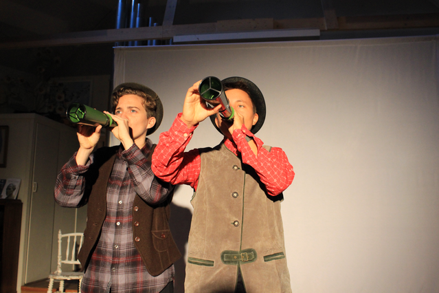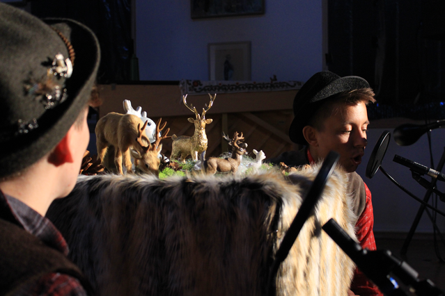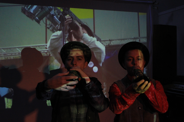 The third etude takes place in a German deer call competition. The two performers pair with a projected video of a competition, snorting and bellowing into their deer calls, and imitating every movement and sound of the human competitors.