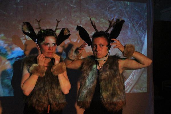 Etudes to become a deer (2017) is a multi-media piece for two performers, video, and objects that traces the transformation of humans into deer.
