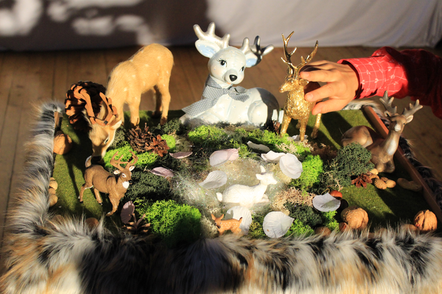 The final etude is deer-ASMR. This etude features dozens of deer figurines found in a dream-like mossy scene. Performing sound with leaves, sticks, carrots, and nuts, the performers tickle the tiny deer ears with a wondrous array of hushed sounds.