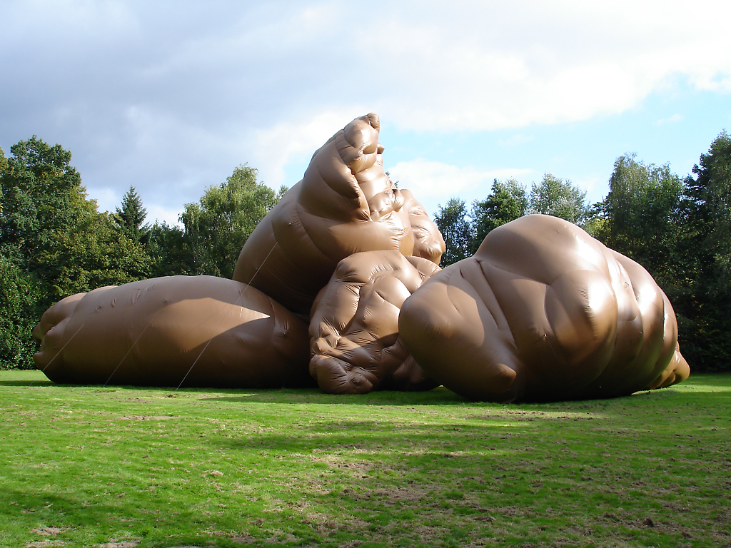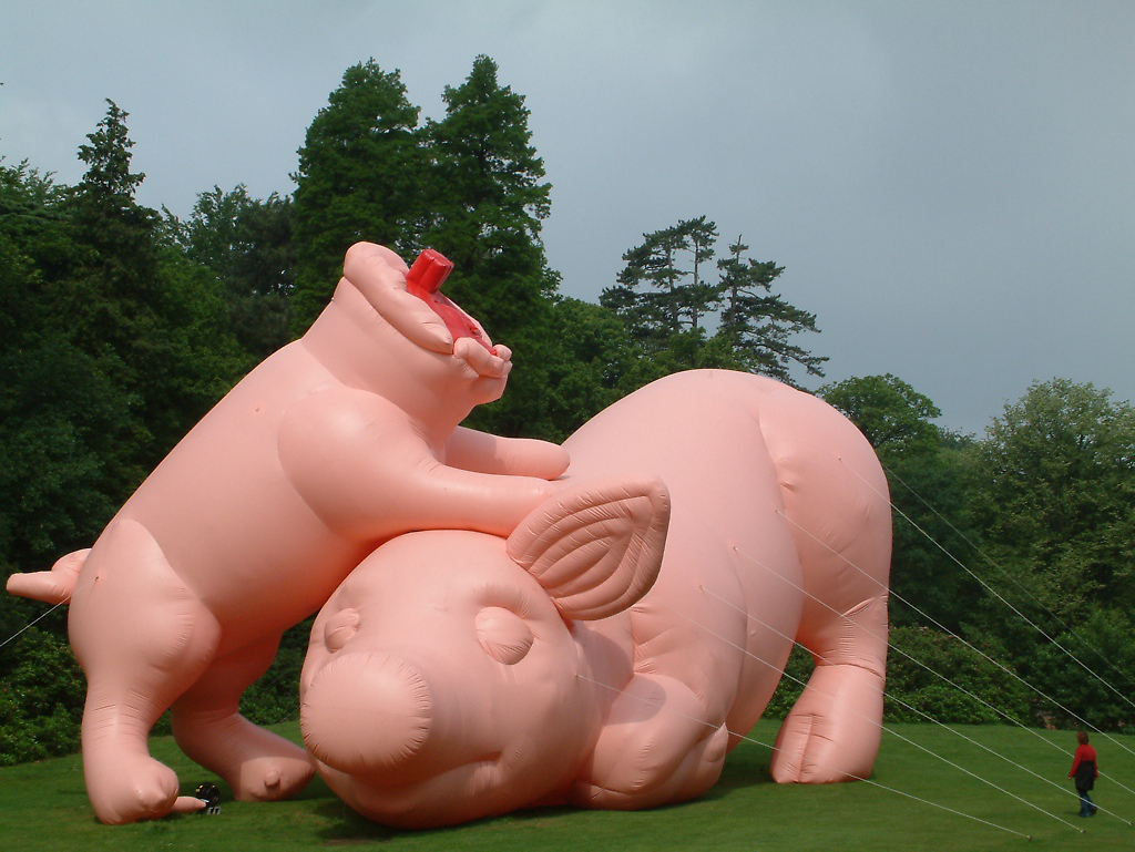 Paul McCarthyn (1945–) puhallettavia ulkoilmaveistoksia: Siat, Pullollinen Kapteeni Morgania, George Bush Jr. ja Paskakasa. Utrecht, Hollanti, 2009.