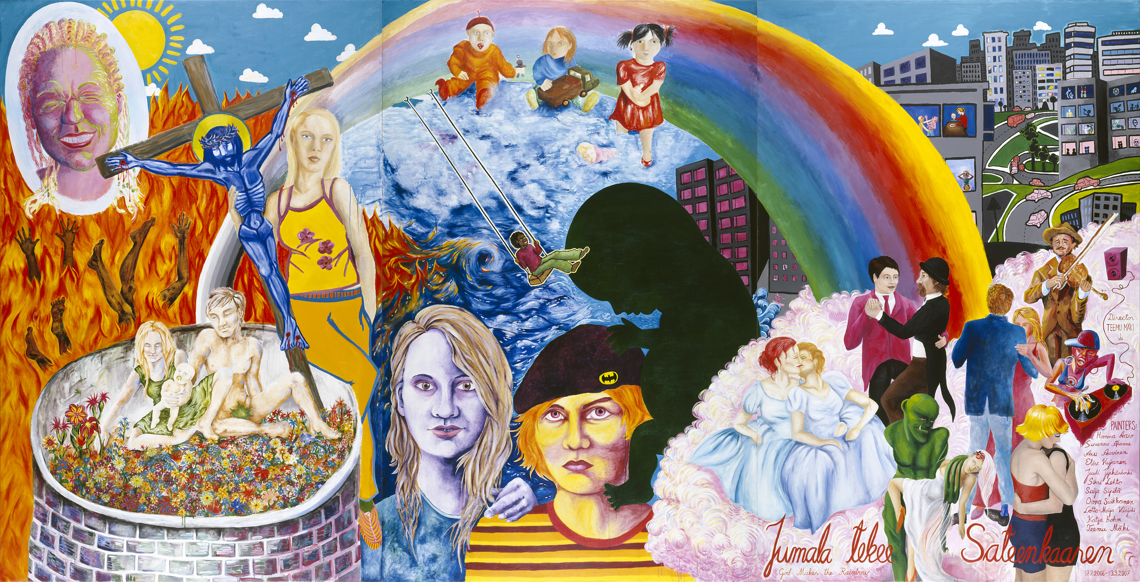 Juha Sääski (1952–): Iloista antajaa jumala rakastaa / God Loves the Merry Filantropist, 2008, öljy kankaalle, 200 x 320 cm.