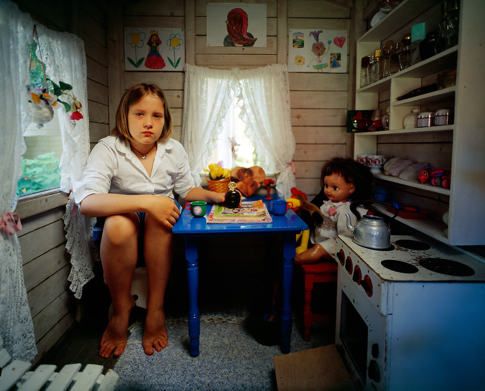 Teemu Mäki: Ursula leikkimökissään, 2006, kromogeeninen digitaalituloste pohjustettu alumiinille, 83 x 103 cm. Sarjasta Miten olla mies tai nainen? (kamera-assistenttina Kenneth Bamberg) http://www.teemumaki.com/teemumakiphotography.html