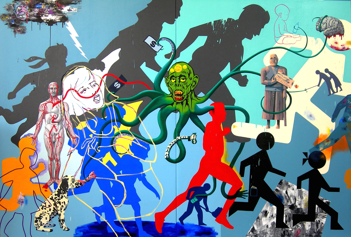 Teemu Mäki: Vittupää / The Pussyhead, 2002–1.12.2006, öljy kankaalle, 360 x 782 cm. http://www.teemumaki.com/alleg_pussyhead.html