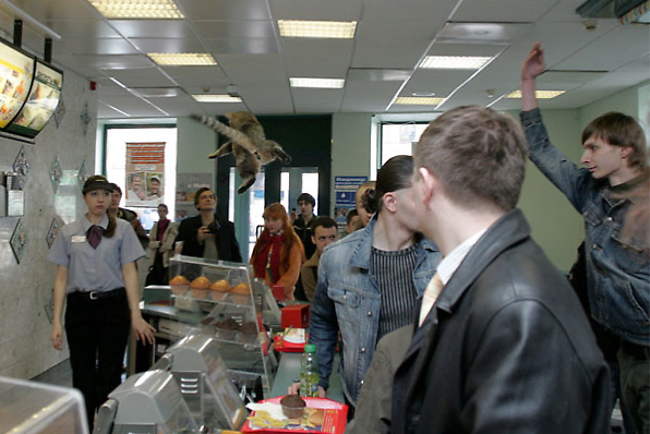 - Työläisten päivä Mäkkärissä, (Workers' Day at McDonalds), performanssi/aktio (Pietari, Venäjä), jossa ryhmä heitti eläviä kissoja tiskin yli työntekijöiden päälle ja ohi, oman sanomansa mukaan "lievittääkseen turruttavan paskatyön aiheuttamaa pitkästystä".