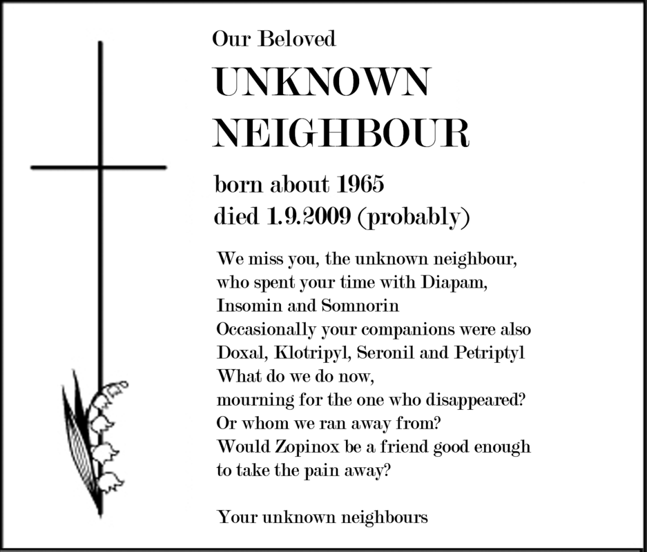 The Consumer / Kuluttaja ja Unknown Neighbour / Tuntematon naapuri, vastamainoksia. Tekijät: Tristan Chijinyman, Simo Haanpää, Henna Inkinen, Katariina Katla, Tirza Ben Porat ja Laura Ukkonen, Markku Hakurin (1946–) & Teemu Mäen opettamalla "Image and Context / Kuva ja konteksti“ -kurssilla Aalto-yliopistossa, Helsingissä 2009. Teokset ovat olleet esillä muutamissa Teemu Mäen kuratoimissa ANTIDOTE-näyttelyissä. http://www.antidote.fi